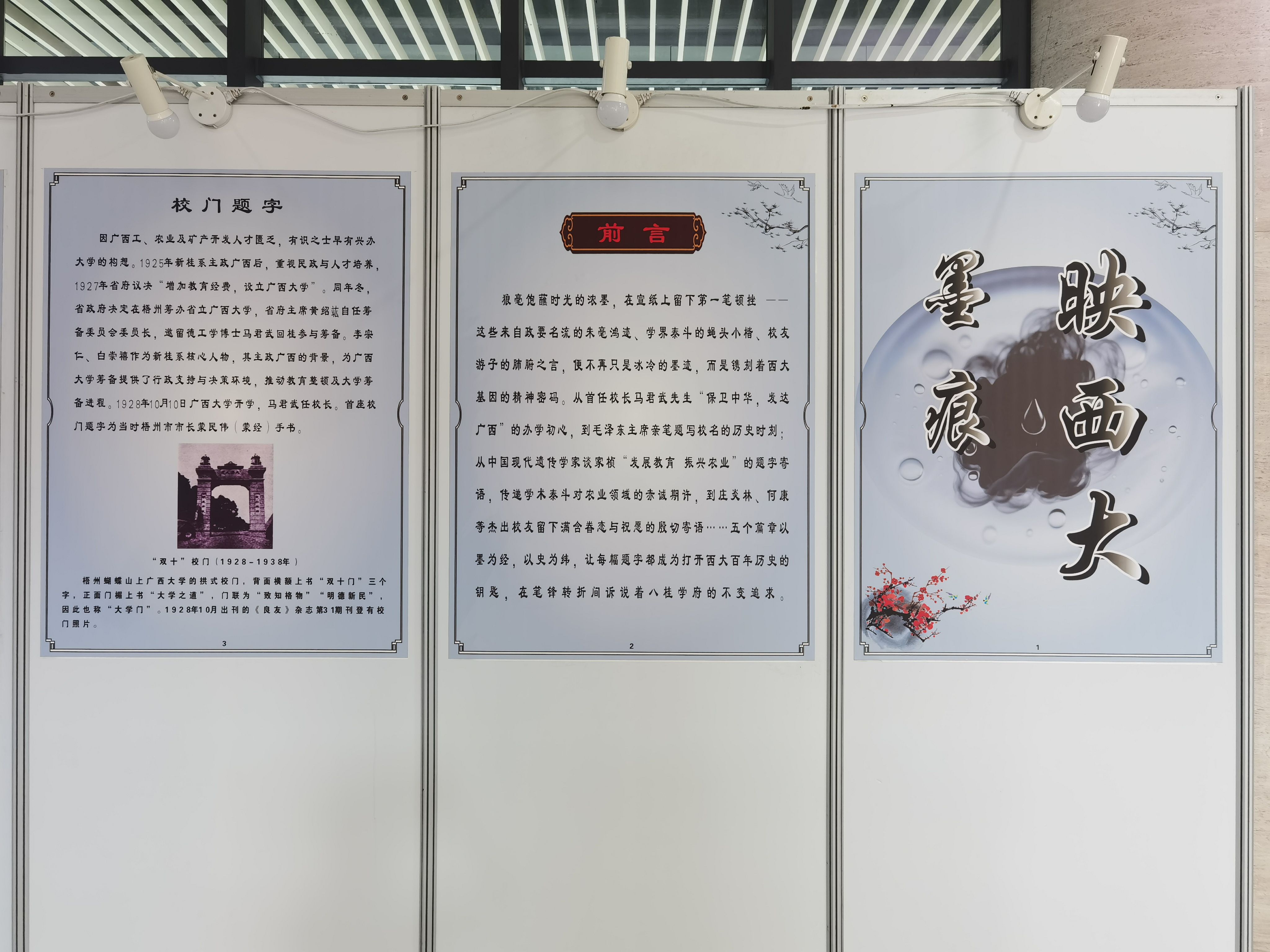 10月13日,广西大学校史专题系列展之“墨痕映西大”名家题词展在图书馆南一楼大厅开展。本次展览精心遴选档案馆珍藏的78幅珍贵题词,时间从1928年建校延续至今,横跨近百年办学历程。