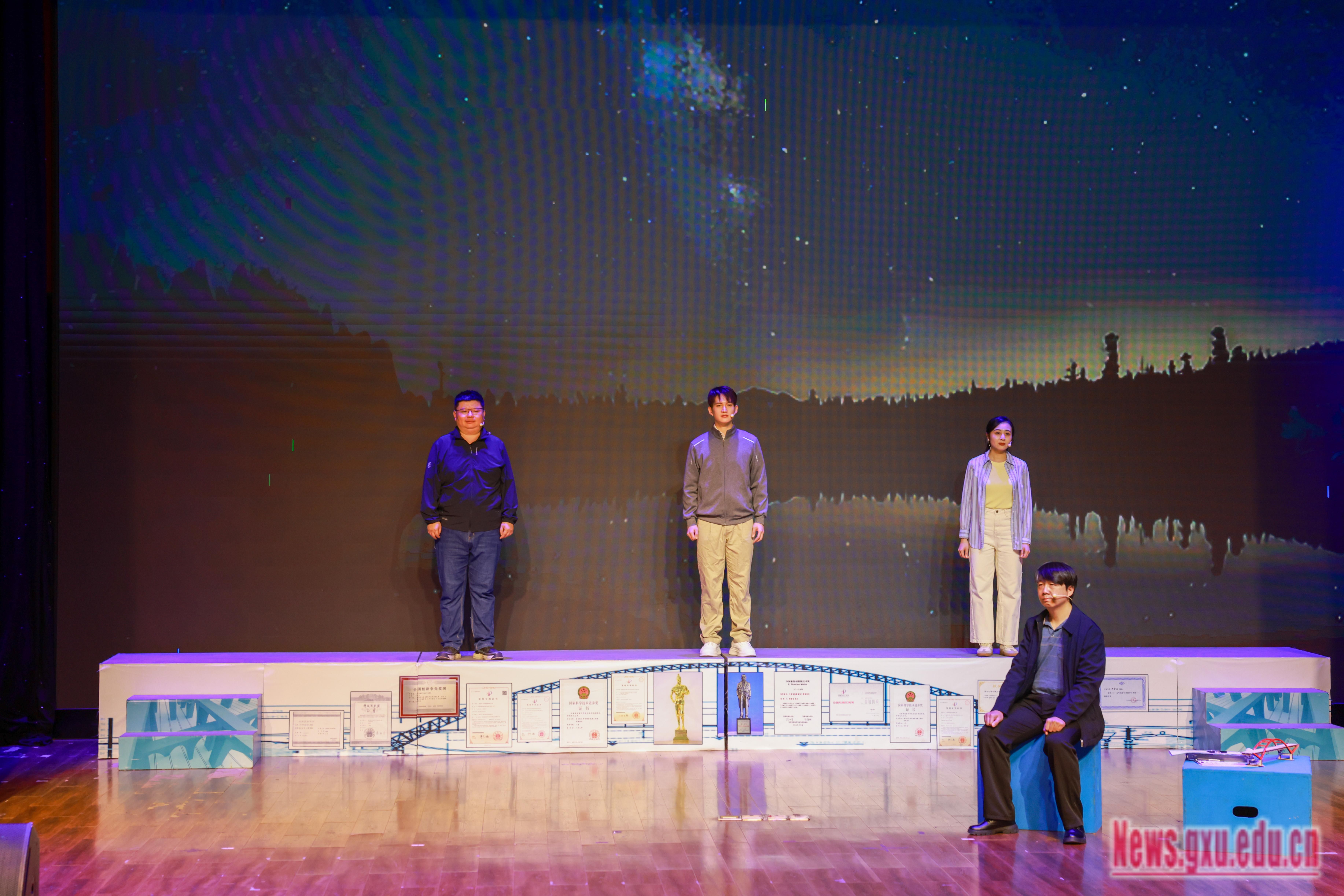 参与活动的师生在大学生活动中心小剧场沉浸式观看了科学家精神优秀剧目展演。演员们以情景再现的形式,演绎了郑皆连院士在艰苦环境中攻坚克难建造平南三桥以及坚守育人初心、行为师范的感人故事。