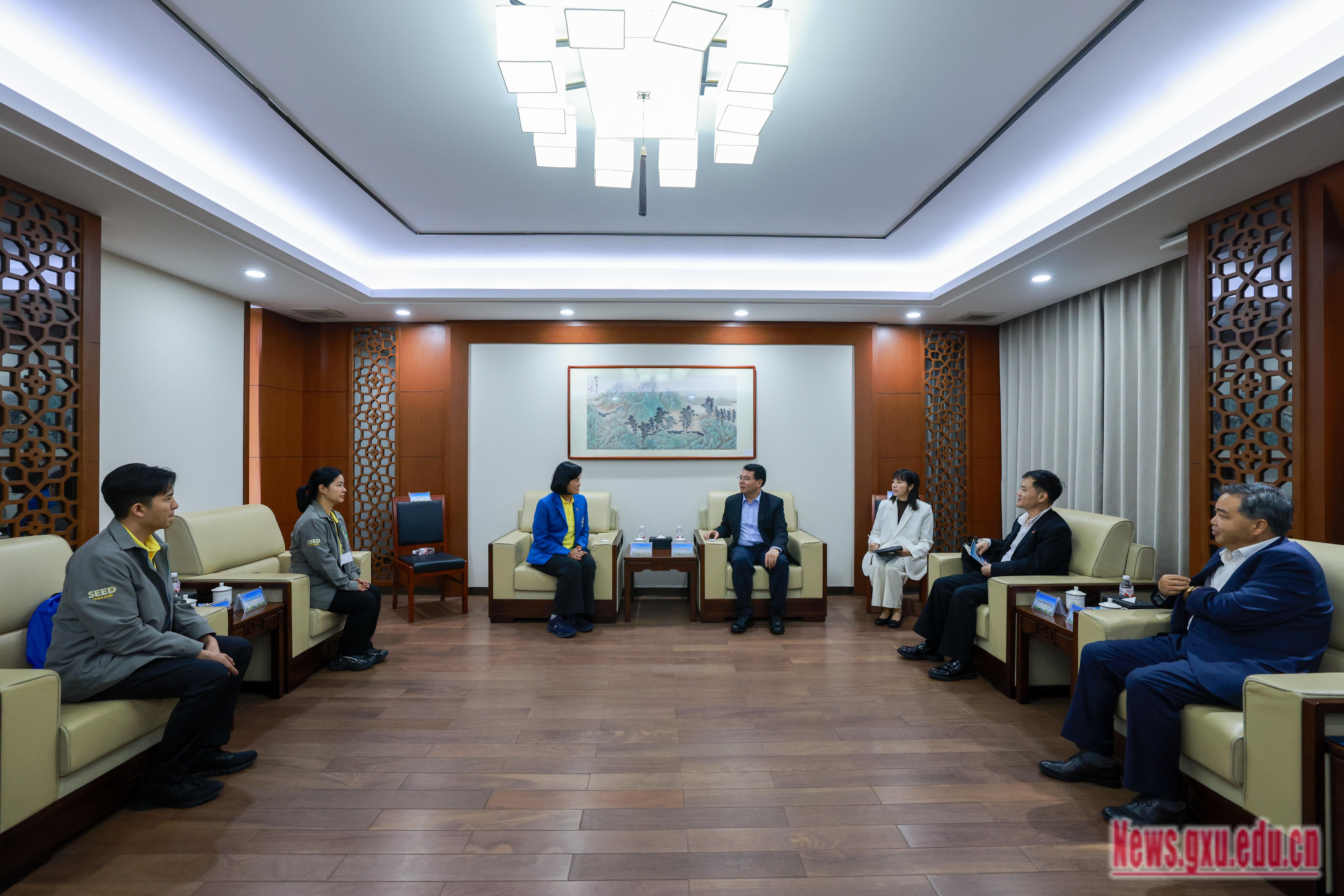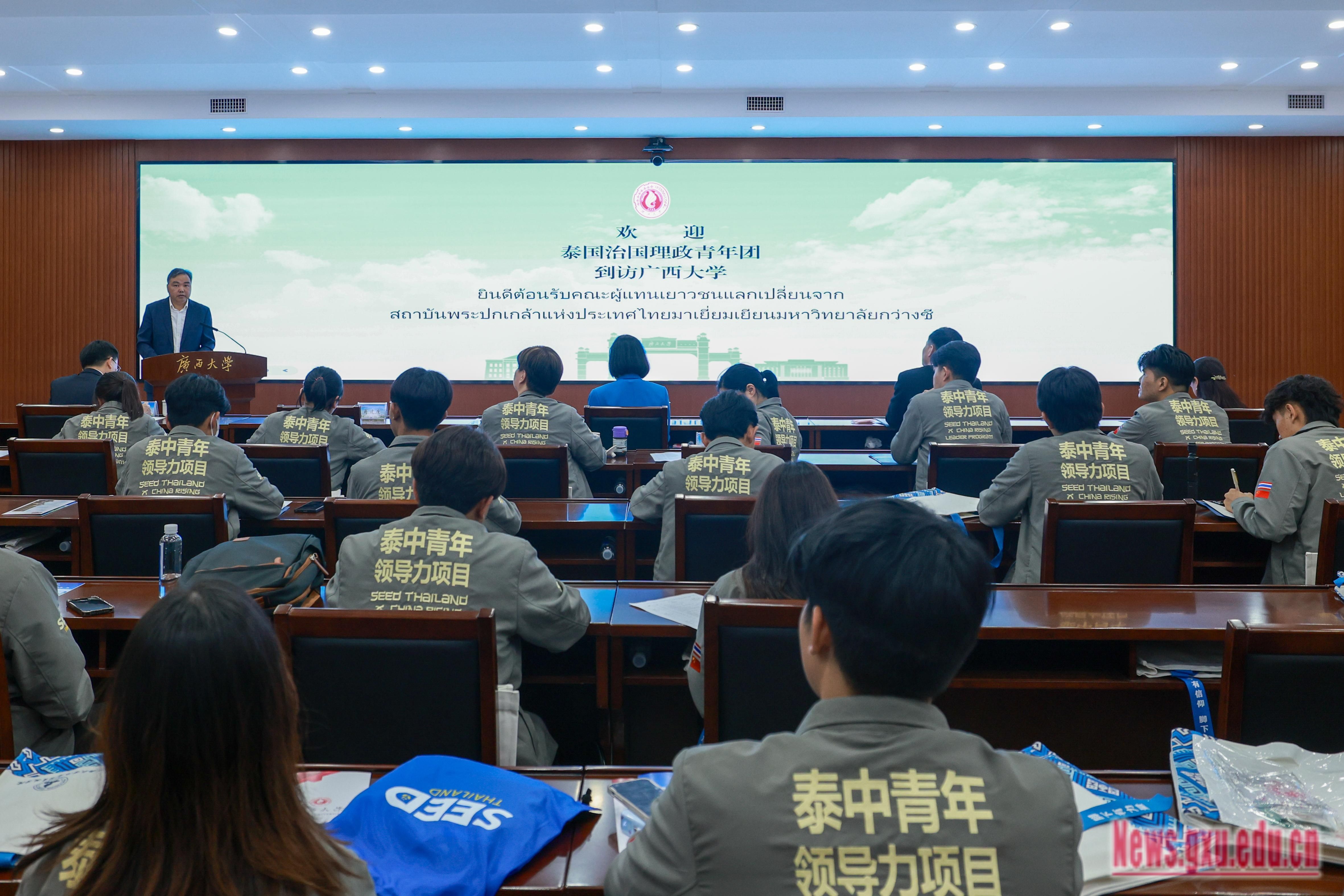 李国忠对代表团到访表示热烈欢迎,他指出,广西大学长期深耕中泰教育文化交流领域,与泰国多所高校建立了坚实合作基础。此次代表团来访搭建了宝贵对话平台,学校希望以此为契机,进一步深化与泰国高校在人才联合培养、学术科研协作、治国理政经验分享等方面的合作;同时诚挚欢迎泰国青年学习汉语与中国文化,选择到广西大学及其他中国高校深造交流,共同续写中泰友谊新篇章。