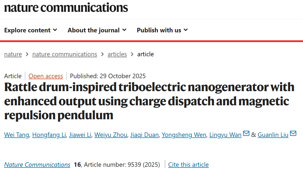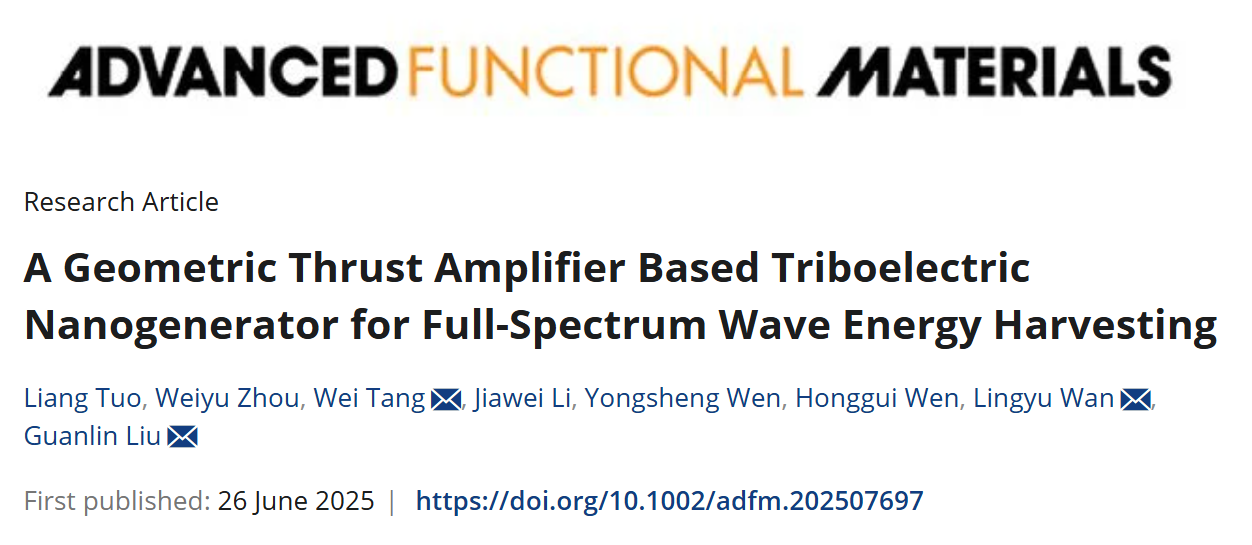 近期,我校物理科学与工程技术学院蓝色能源团队在基于摩擦纳米发电机(TENG)高效采集低频海洋波浪能方面取得进展。研究成果分别以“Rattle drum-inspired triboelectric nanogenerator with enhanced output using charge dispatch and magnetic repulsion pendulum”为题发表于期刊《自然通讯》(Nature Communications),第一作者为2025级物理学博士研究生唐卫,通讯作者为物理科学与工程技术学院副教授刘官林、教授万玲玉;以“A geometric thrust amplifier based triboelectric nanogenerator for full-spectrum wave energy harvesting”为题发表于国际知名期刊《先进功能材料》(Advanced Functional Materials), 第一作者为物理科学与工程技术学院硕士生庹亮,通讯作者为唐卫、万玲玉、刘官林。广西大学为以上两篇论文的唯一通讯单位。