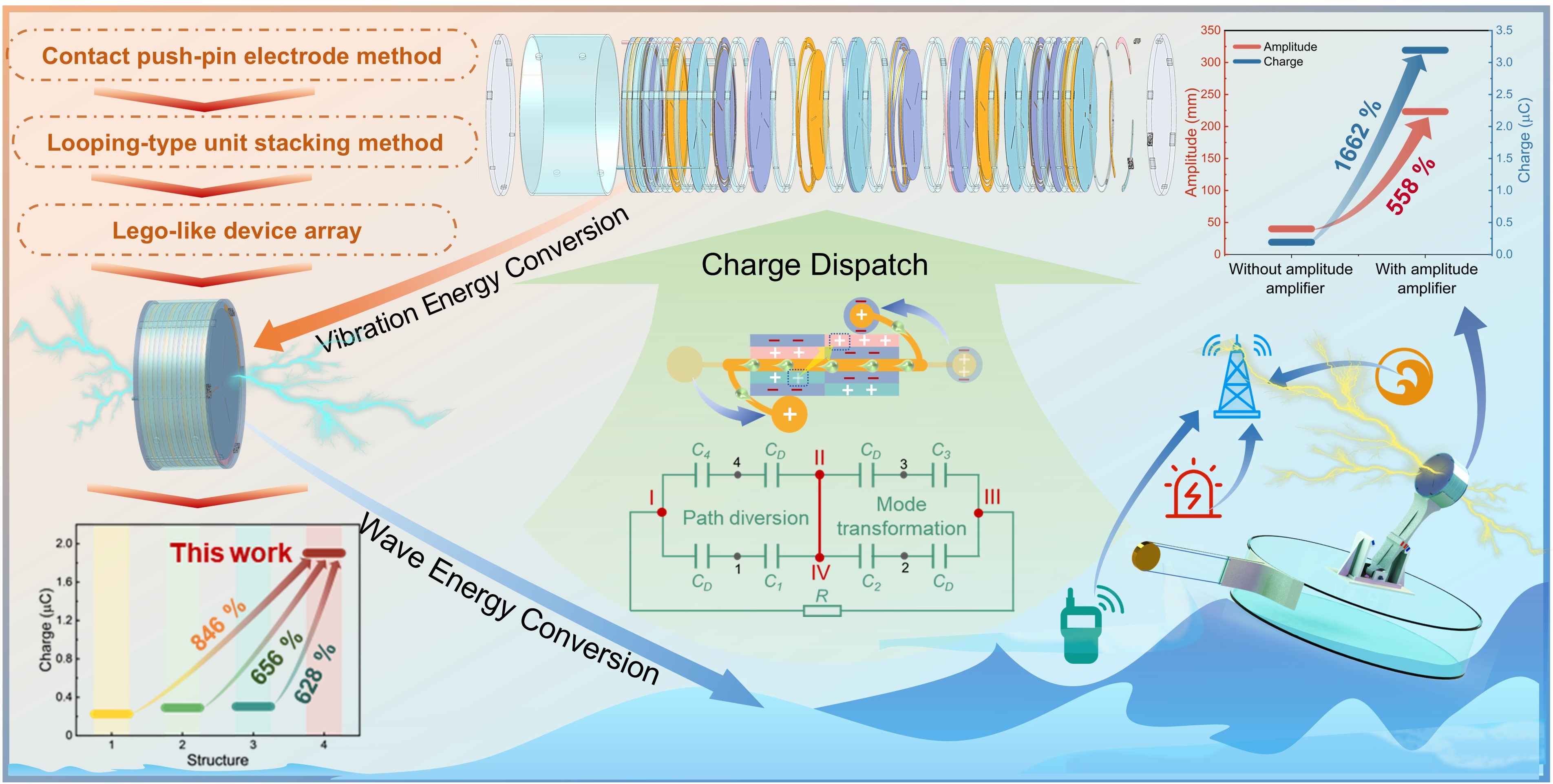 针对传统技术低频海洋波浪能采集效率低的瓶颈问题,该团队提出拨浪鼓式TENG,通过三电极与交替覆膜策略实现高密集摩擦层间的电荷调度,使外电极输出提升超过6倍。引入降频增幅磁斥力摆,有效转化低振幅高扭矩波浪激励为高振幅低扭矩摆动,运动振幅和输出性能分别提升558%与1662%,在低海况下实现稳定发电。团队系统完善了涵盖结构、电学与应用导向的综合评价体系,为波浪能TENG在复杂海况下的高效采集及产业化应用提供了重要参考。