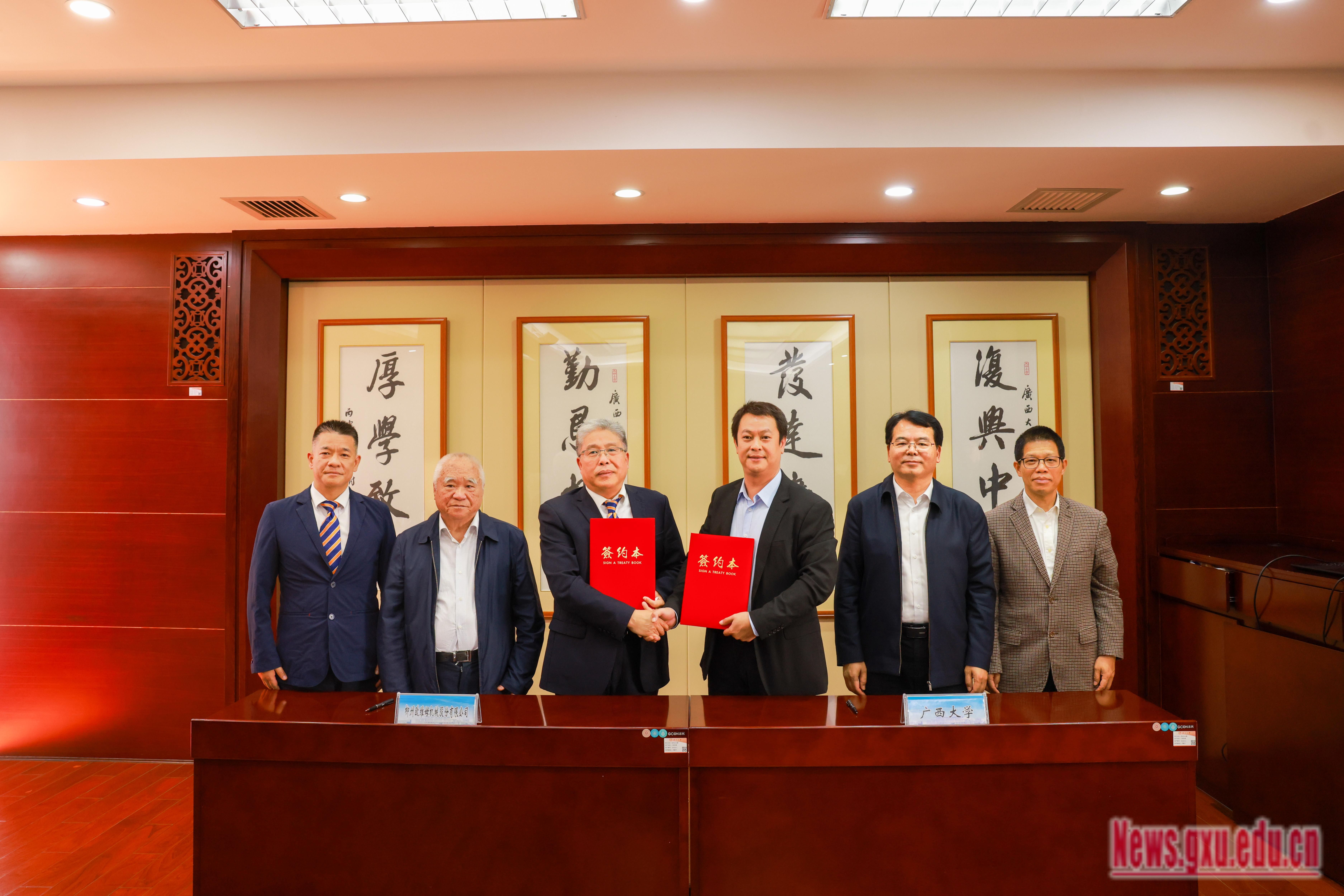 在郑皆连、李国忠、宁旭初、陈昱鹏等共同见证下,双方代表签署“广西大学郑皆连-OVM预应力基金”捐赠协议。随后,郑皆连与陈昱鹏共同捐赠奖学金,李国忠代表学校接受捐赠牌并颁发捐赠证书。
