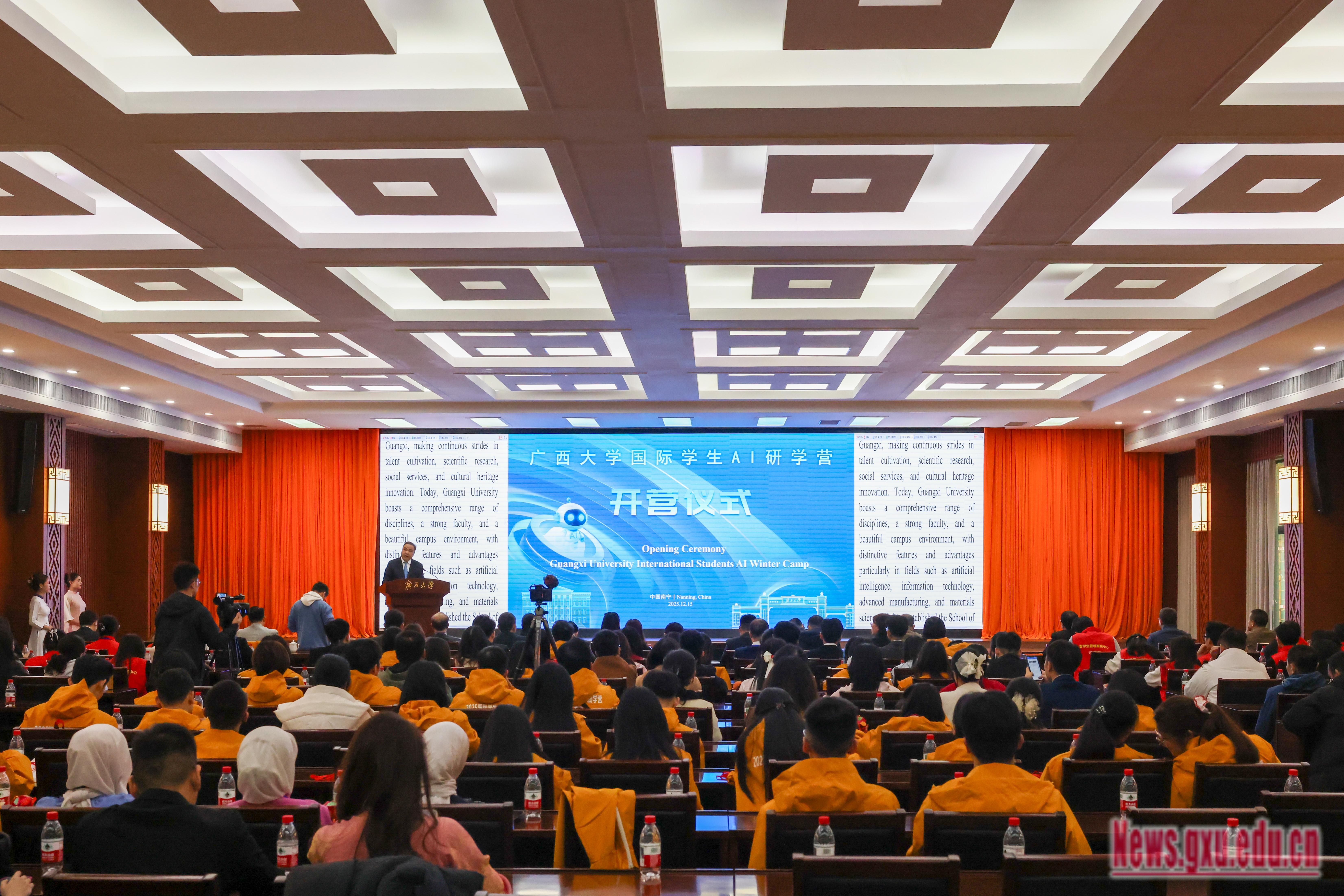 12月15日,广西大学国际学生AI研学营开营。广西大学党委副书记、校长肖建庄,越南河内国家大学合作与发展部副部长、代表团团长阮忠显出席开营式并致辞。越南河内国家大学团委书记许清华出席开营式。