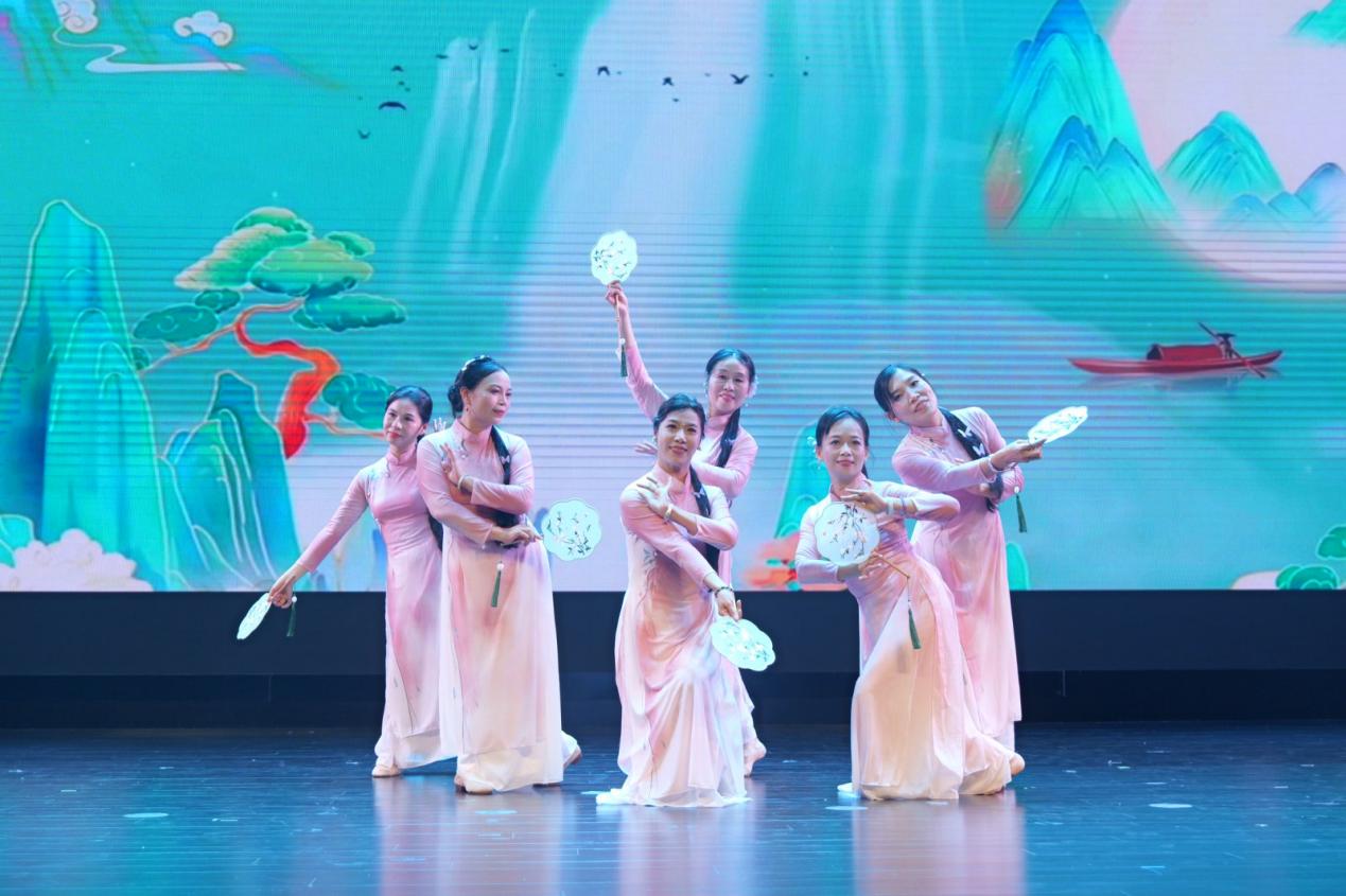 晚会在《我爱你中国》拉丁舞表演中拉开序幕,经典红歌的旋律与热情洋溢的拉丁舞步融合,瞬间点燃了现场气氛。瑜伽《不染》用优雅的肢体语言,以静制动,在动与静的结合中,达到身体、心灵与精神的和谐统一。中国舞《天浴》中舞者以最虔诚的姿态,对话天地、对话自己、坚守初心、勇担使命。《太极拳》的表演者们行云流水般的动作,展现了教职工繁忙工作之余修身养性、积极健康的精神风貌。中国舞班的《青花瓷》以瓷韵喻廉心,老年合唱团的《姑娘赶圩泉边过》以歌声颂团结,整场演出精彩纷呈,兼具艺术美感与思想内涵。