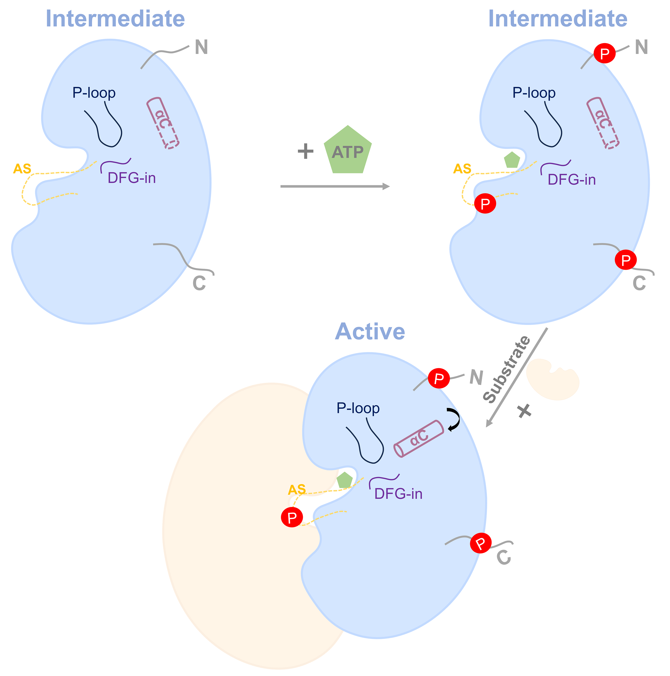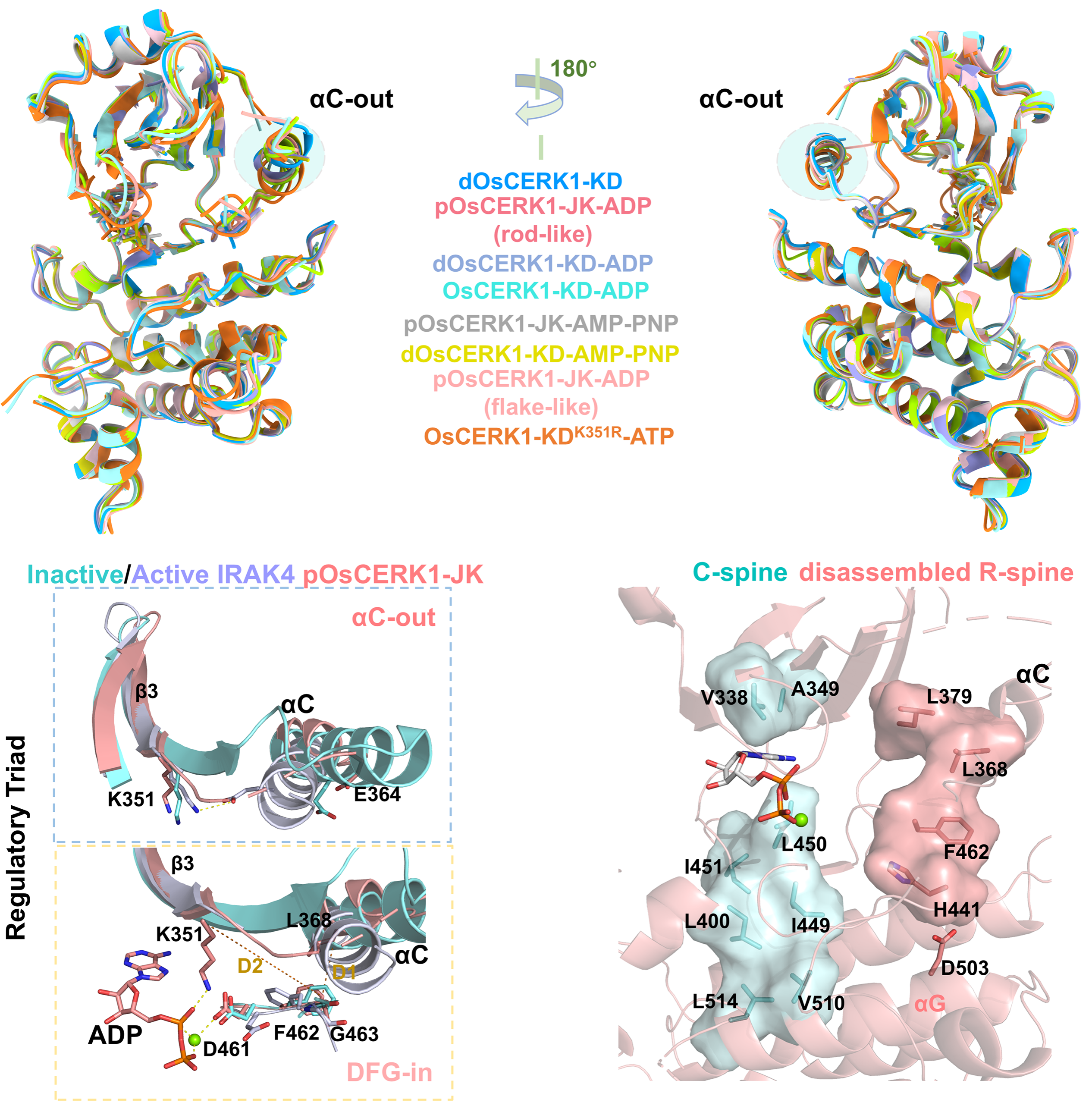 针对这一问题,该研究团队综合运用结构生物学、生物化学和功能遗传学方法,系统解析了OsCERK1蛋白胞内激酶结构域在9种不同状态下的三维结构。研究发现,该激酶呈现出一种独特的“中间态”构象,这种特殊构象能够在缺乏外源刺激的情况下防止信号通路的非特异性激活,从而保证了信号传递的精确性。