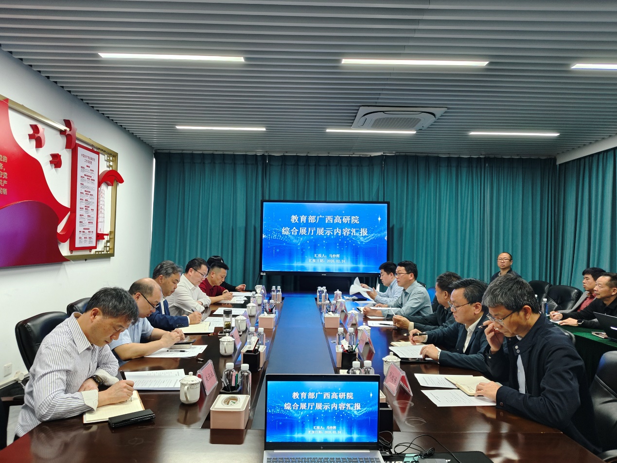 赵双良对广西高研院展厅建设、创新合作座谈会、研究生招生录取等工作作具体部署。综合事务管理部相关负责同志汇报了展厅建设进展情况、存在困难及下一步工作计划。与会人员围绕展厅硬装、展示内容设计等展开深入研讨,提出意见建议。