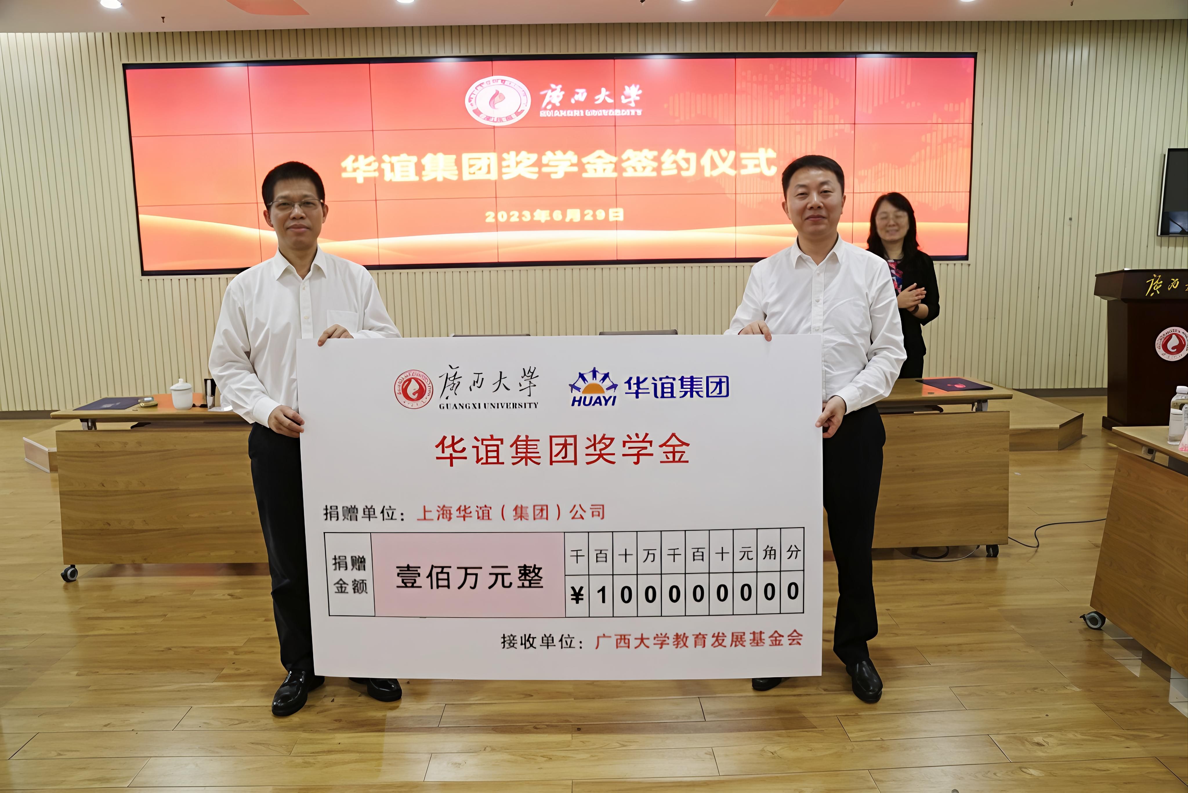 6月29日,“华谊集团奖学金”签约仪式在广西大学校友服务中心会议厅举行。我校党委常委、总会计师宁旭初,华谊集团党委委员、副总裁刘文杰出席签约仪式。
