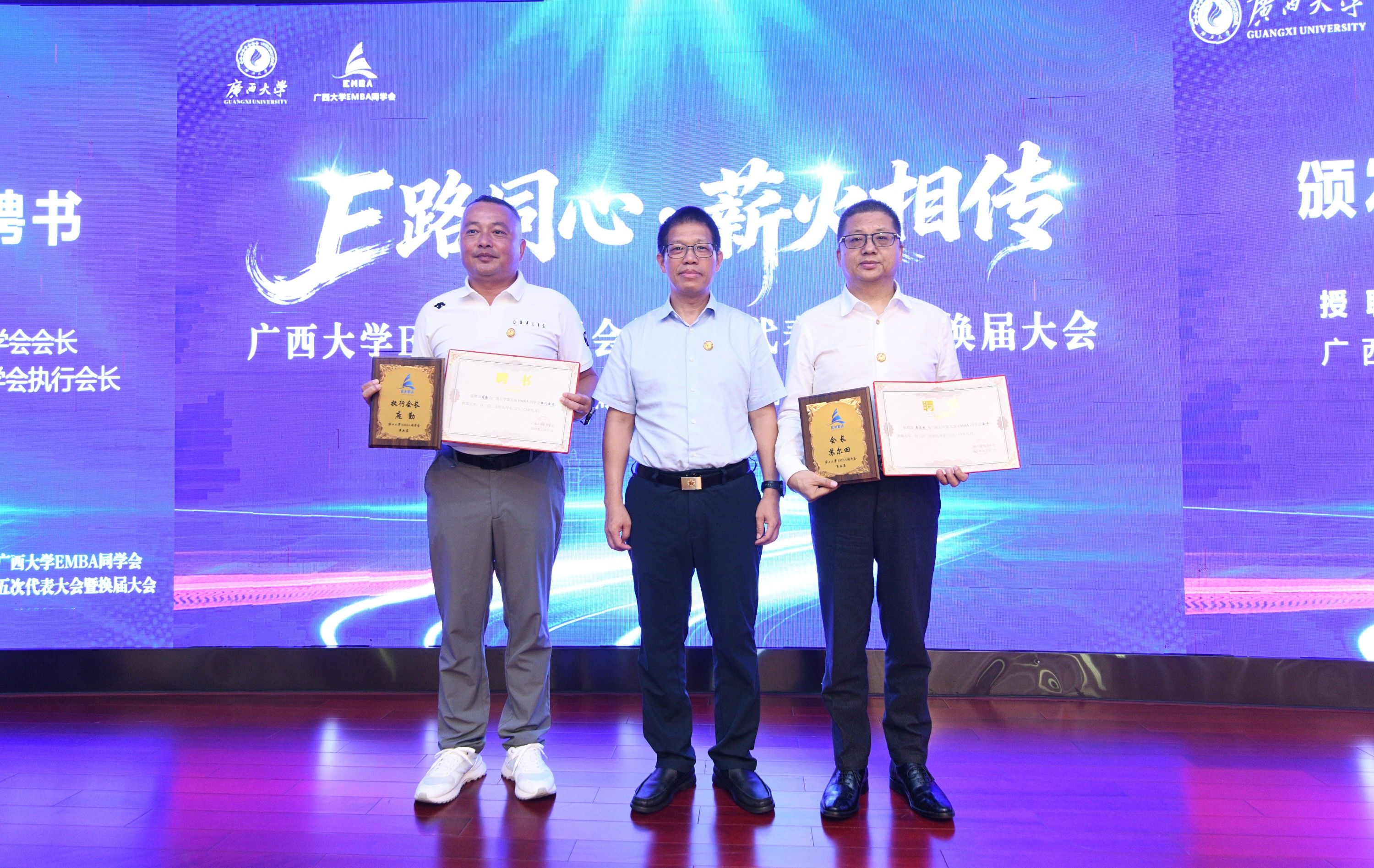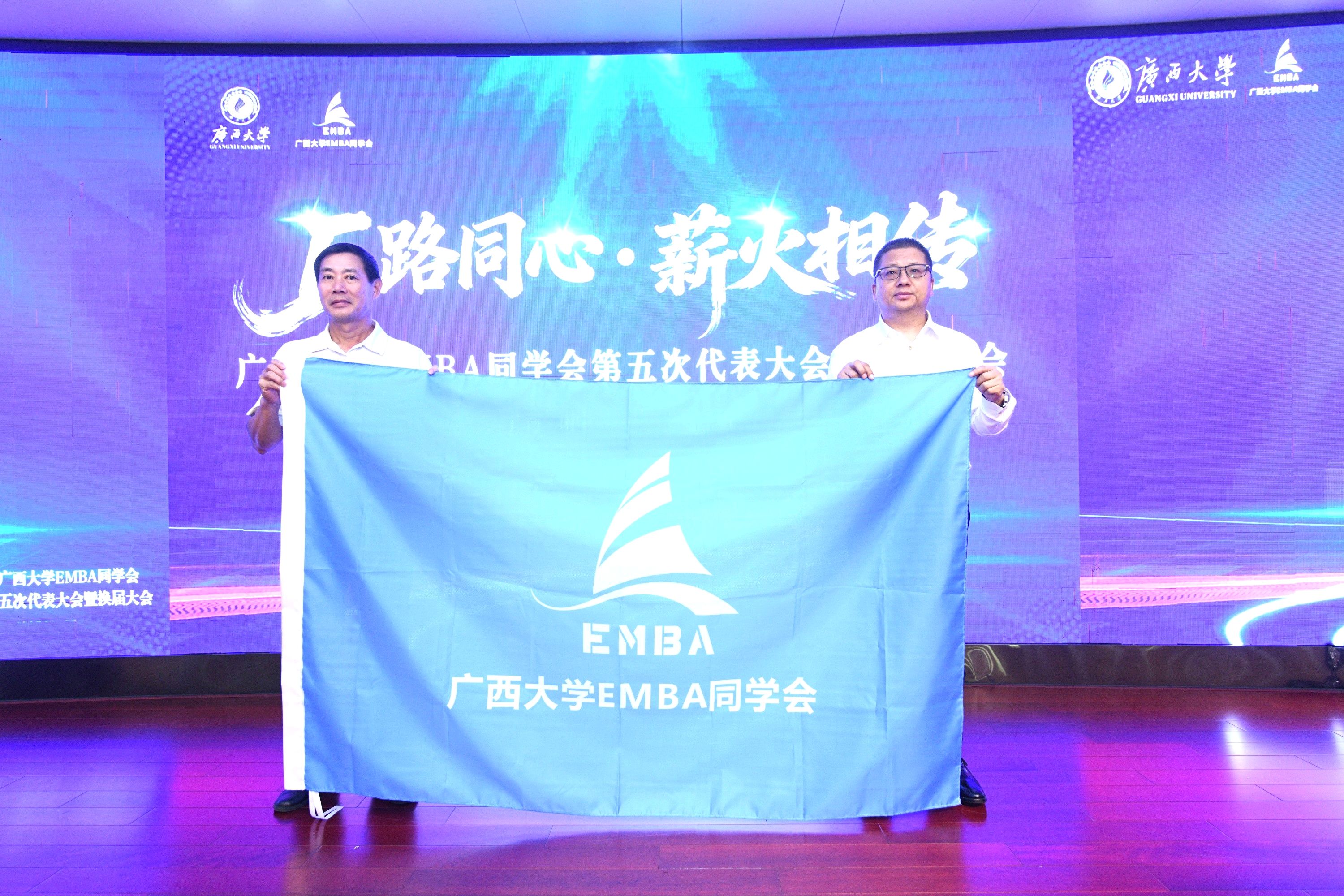 大会宣读了广西大学校友总会批文,听取了第四届EMBA同学会会长钟毅作工作报告,审议并通过了《广西大学EMBA同学会章程(修订)》、《广西大学EMBA同学会第五届组织机构成员建议名单》。会上,执行会长黎英征代表筹备组就大会筹备、章程修订、机构组织成员的提名和建议名单的确定等进行说明。校友苏尔田当选为新一届会长,庞勤、陈轲当选为新一届执行会长和秘书长,出席大会代表、嘉宾共同见证了会旗交接仪式。宁旭初等为第四第五届组织机构成员分别颁发荣誉牌匾和聘书。