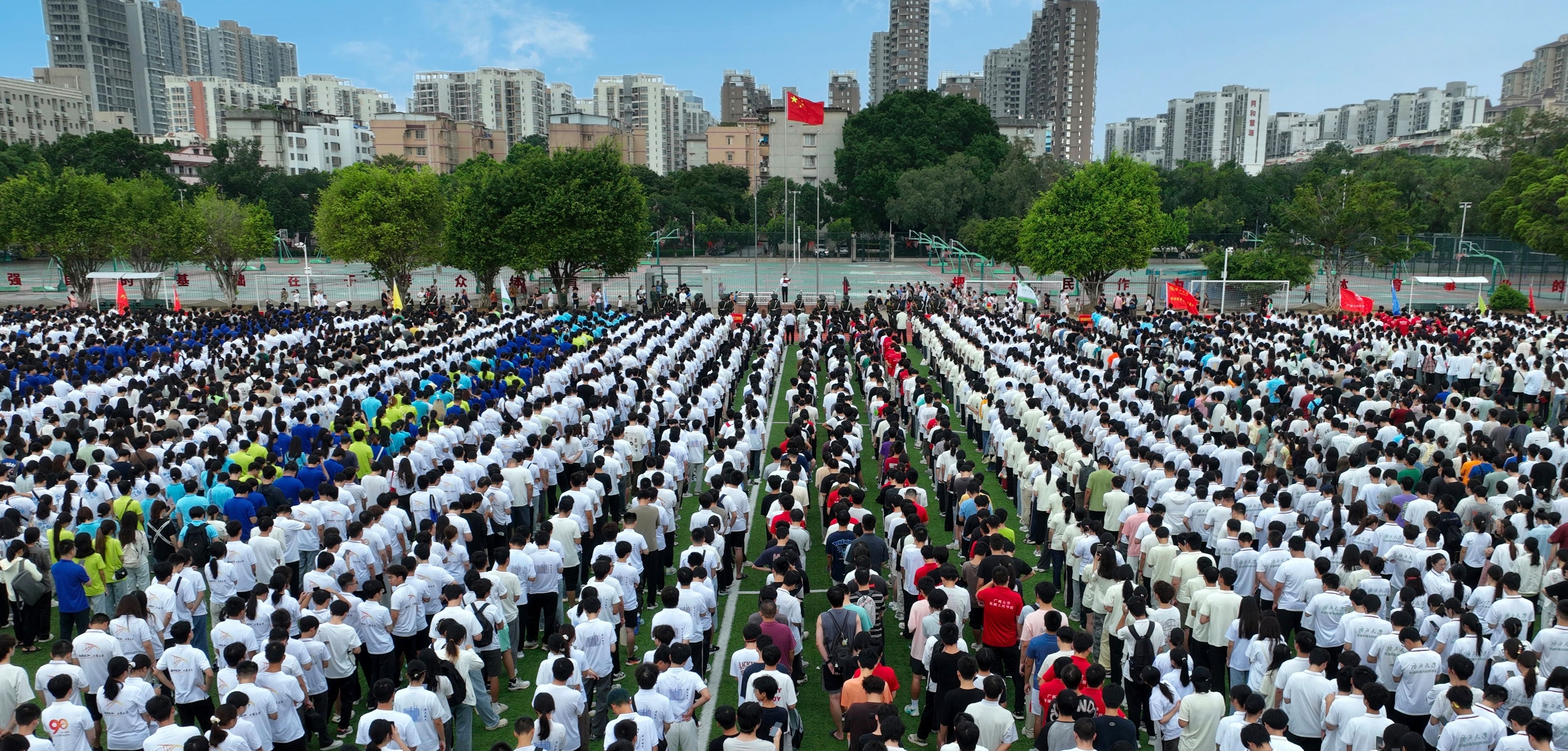 为大力弘扬爱国主义精神,激励广大师生以昂扬姿态奋进新征程,10月1日清晨,我校在西校园体育场举行国庆升旗仪式。师生代表共计4000余人参加仪式,共同祝福祖国繁荣昌盛、国泰民安。