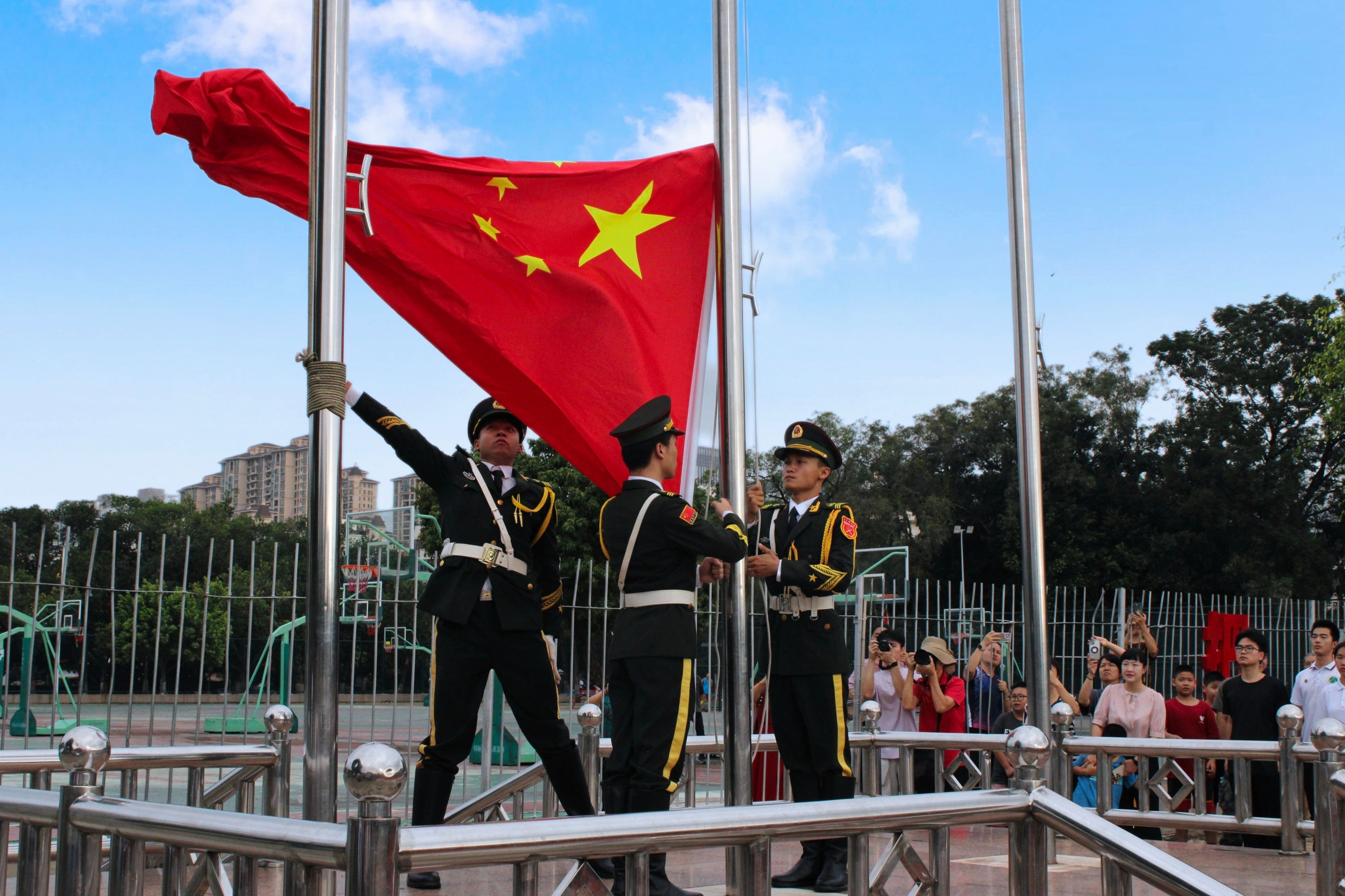 上午8时,升旗仪式正式开始。英姿飒爽的国旗护卫队迈着铿锵有力、整齐划一的步伐,护卫着鲜艳的五星红旗走向升旗台。伴随着《义勇军进行曲》,五星红旗迎风展开,在晨曦中冉冉升起。