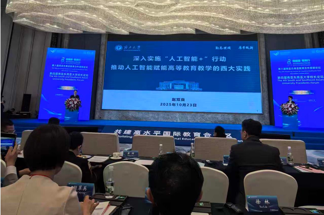 10月23日,我校应邀参加第八届南亚东南亚教育合作昆明论坛暨第四届南亚东南亚大学校长论坛。校党委常委、副校长赵双良受邀出席并作题为《深入实施“人工智能+”行动,推动人工智能赋能高等教育教学的西大实践》的主题报告。