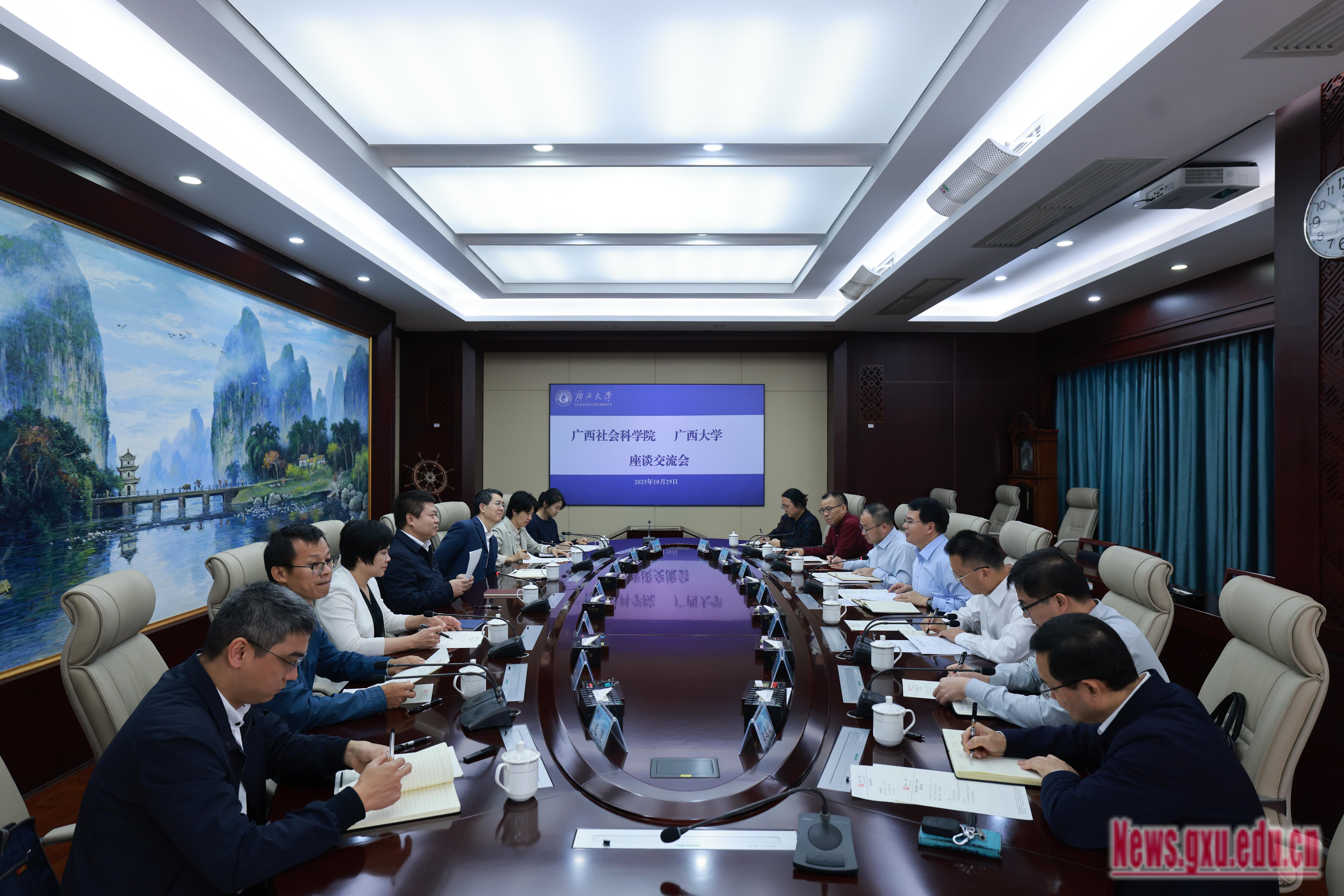 10月29日,广西社会科学院党组书记、院长张洪石一行到校调研交流。校党委书记李国忠主持座谈会,校党委常委、副校长夏国恩陪同调研。