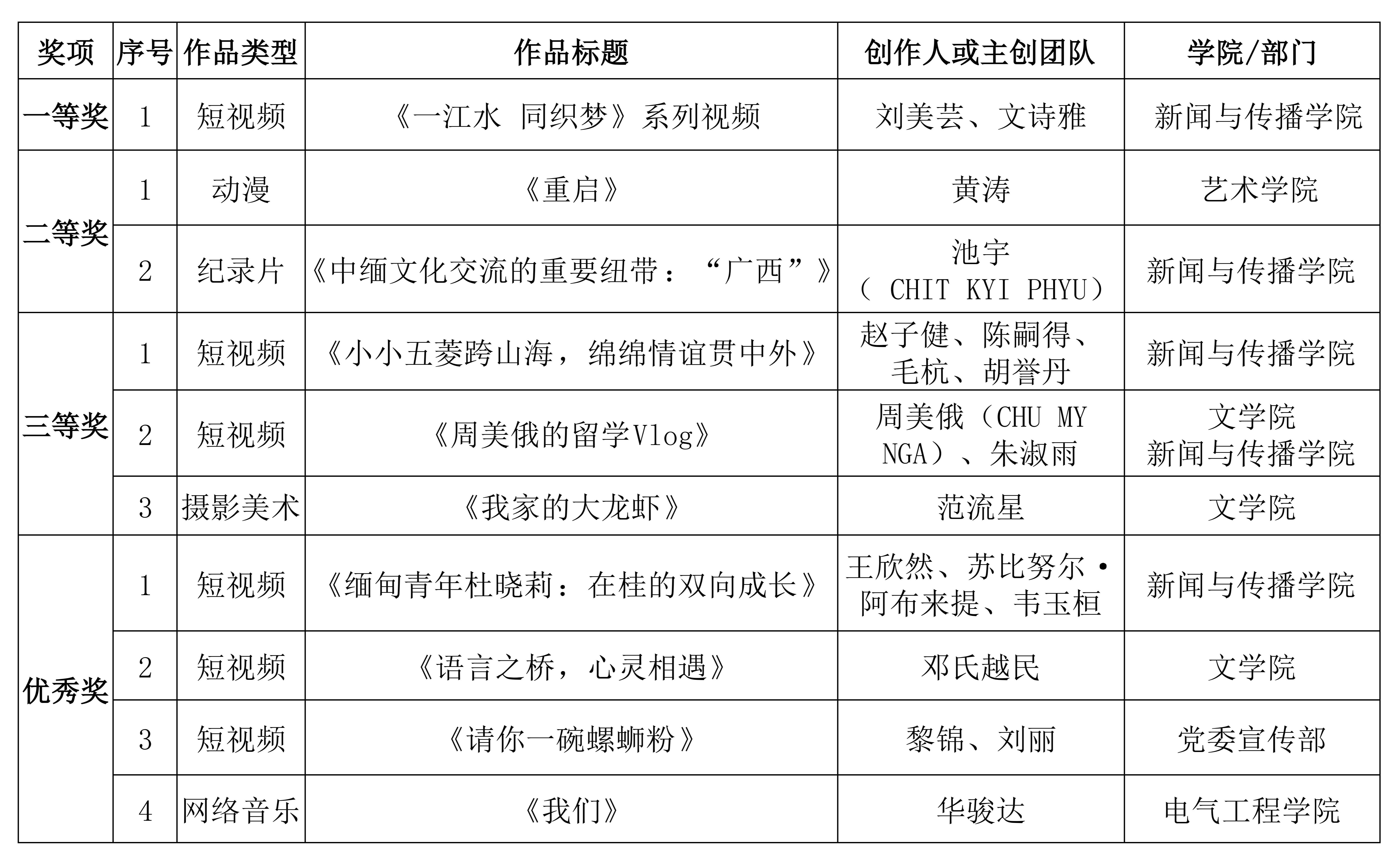 活动中,傅慧芬结合自身求学经历,以“怀揣梦想跨越山海,以青春力量续写胞波情谊新篇章”为题,分享了生动的求学故事。在中国—东盟青年拍客数智创作计划获奖作品发布环节,我校作品斩获一等奖1项、二等奖2项、三等奖3项、优秀奖4项。