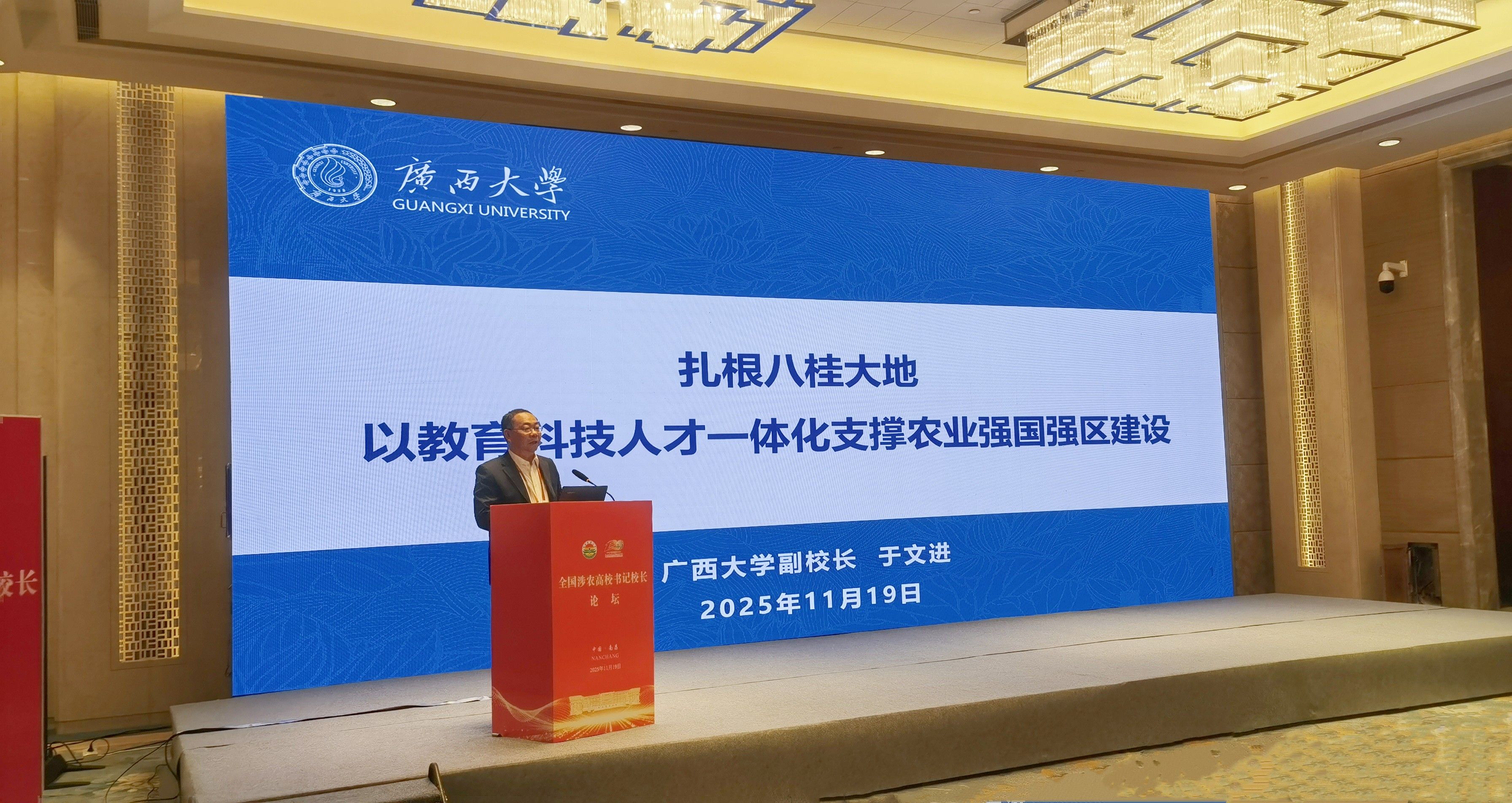 在2025全国涉农高校书记校长论坛上,于文进代表学校作了题为《扎根八桂大地 以教育科技人才一体化支撑农业强国强区建设》的专题报告,系统介绍了我校在服务国家农业现代化建设和地方经济社会发展中的实践成果与经验思考,展现了学校以高质量教育科技人才工作助力农业强国建设的积极作为。