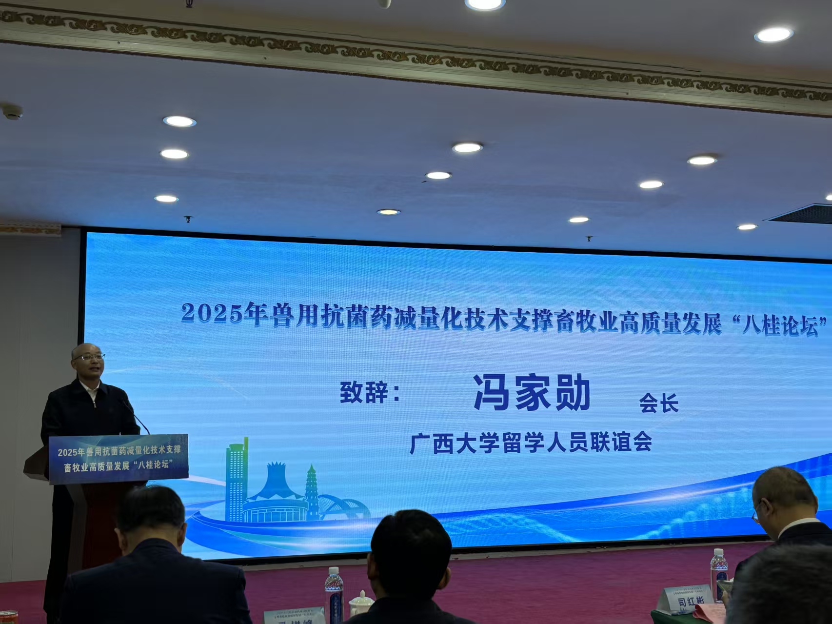 11月22-23日,由广西畜牧兽医学会中兽医与兽药学分会、广西动物保健品协会、广西大学留学人员联谊会(以下简称“校留联会”)等机构联合主办的2025年兽用抗菌药减量化技术支撑畜牧业高质量发展“八桂论坛”在南宁召开。广西大学原副校长、广西欧美同学会副会长、留联会会长、教授冯家勋出席开幕式并致辞。