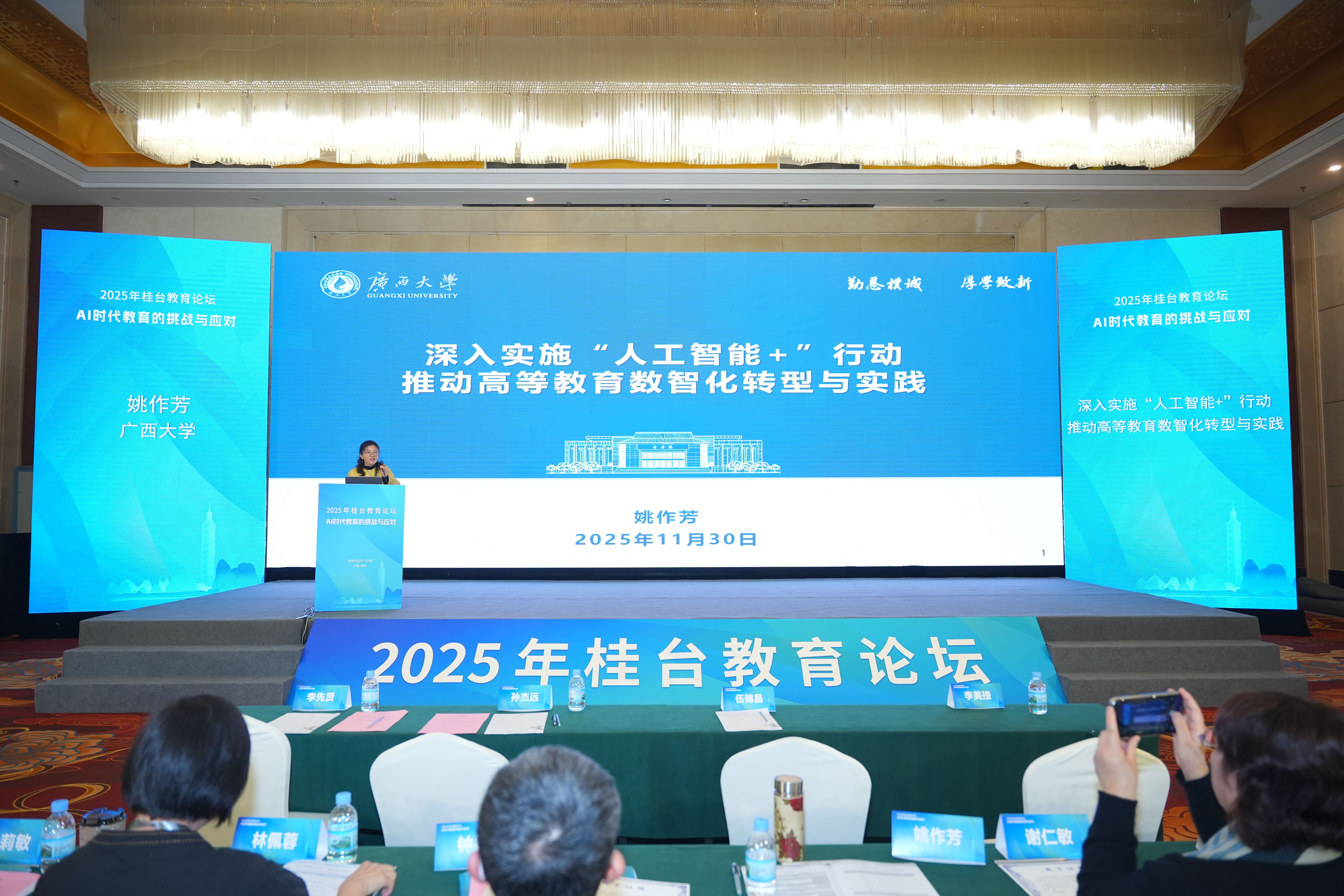 近日,2025年桂台教育论坛在桂林召开。校党委常委、统战部部长、校长助理姚作芳参加会议,并作题为《深入实施“人工智能+”行动 推动高等教育数智化转型与实践》的主题报告。