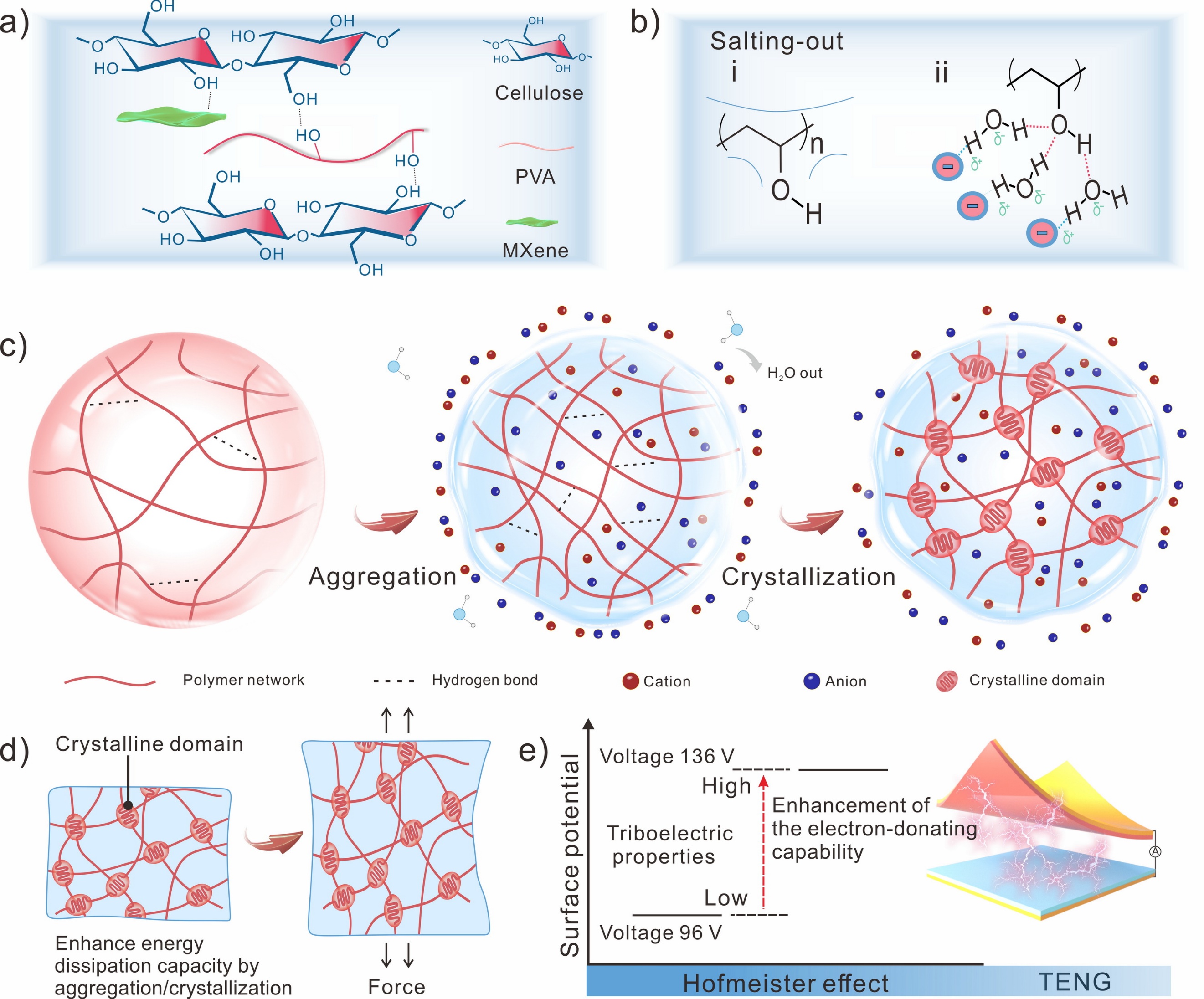 近日,我校轻工与食品工程学院先进木质纤维材料课题组在纤维素摩擦电材料研究中取得新进展,研究成果以“Harnessing the Hofmeister Effect for Simultaneous Strengthening and Toughening of Cellulosic Triboelectric Materials”为题发表于国际学术期刊Angewandte Chemie International Edition上。论文的第一作者为我校师资博士后蔡晨晨,通讯作者为轻工与食品工程学院教授聂双喜,我校为该论文唯一完成单位。