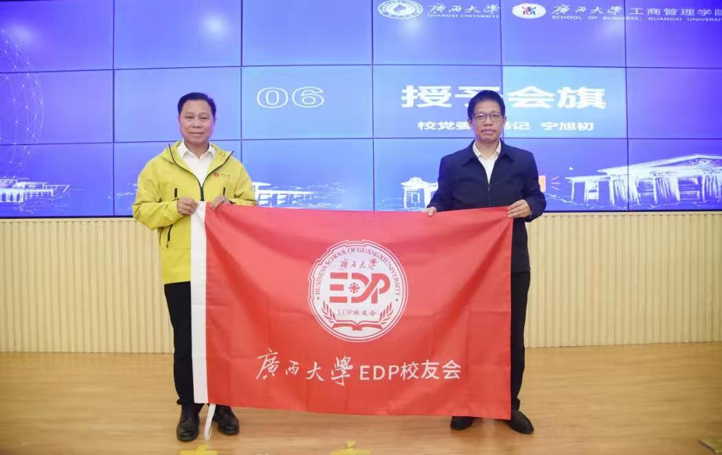 校友办主要负责同志宣读同意成立EDP校友会的批文。会议审议通过了《广西大学EDP校友会章程(草案)》,选举产生了以胡竞选、龙其生为名誉会长,吴全满为首任会长,曾戟为执行会长的新一届组织机构成员,并举行会旗授予仪式、颁发聘书。现场还举行了EDP校友会向广西大学教育发展基金会捐赠仪式。