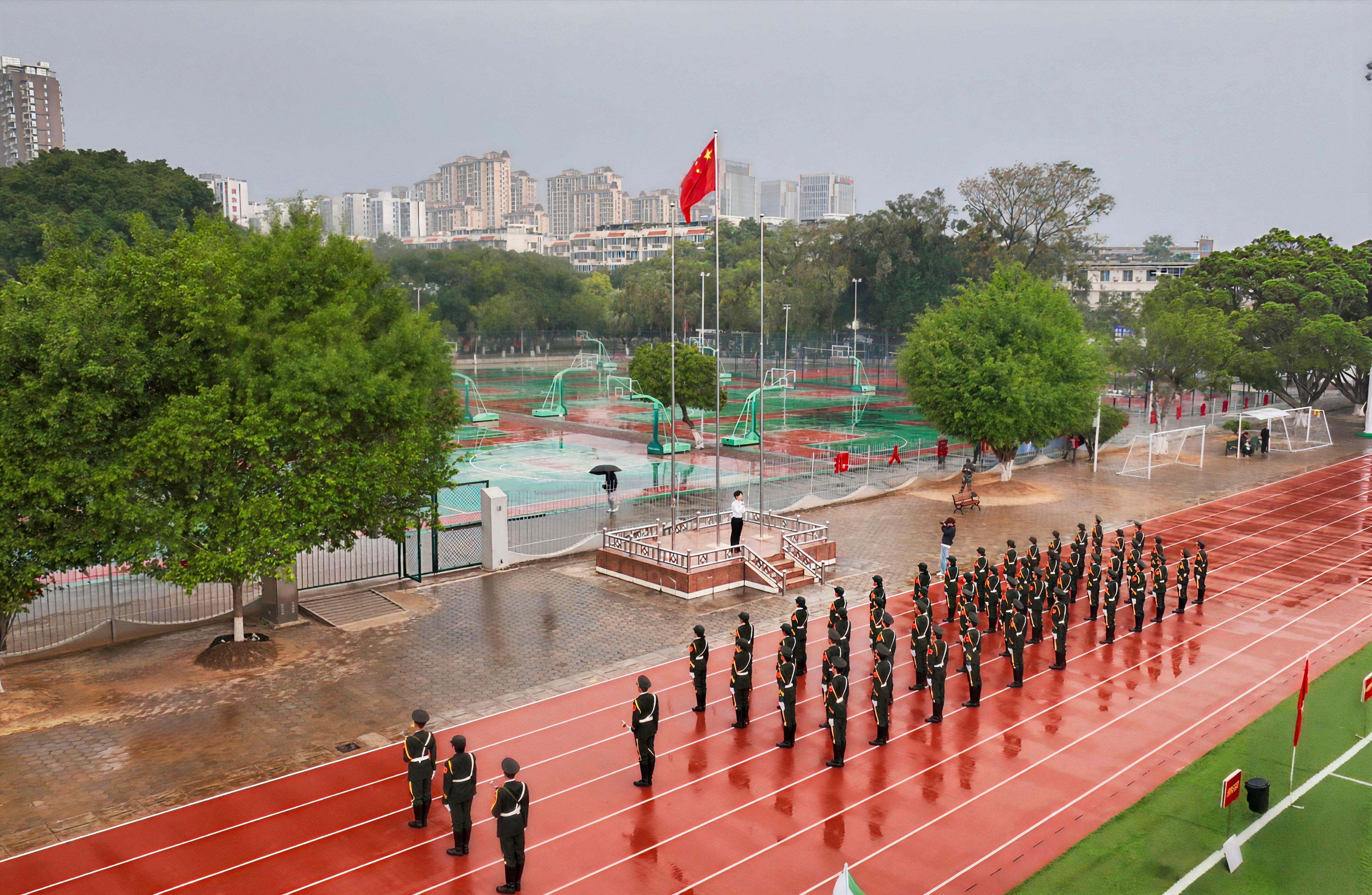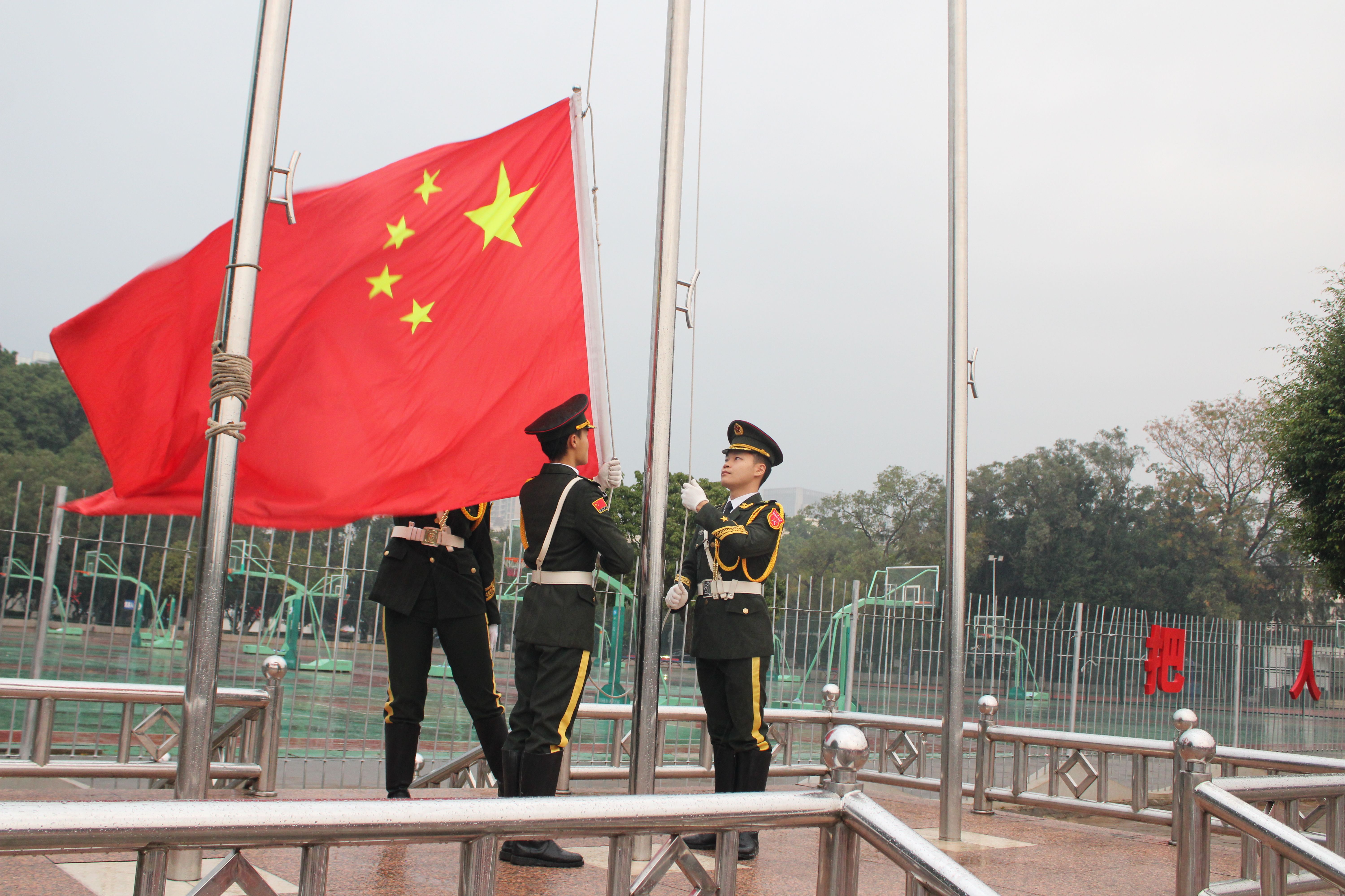 国旗飘扬,誓言铿锵。仪式现场,师生整齐列队,庄严肃立。在激昂的国歌声中,鲜艳的五星红旗冉冉升起,全体人员面向国旗行注目礼,深情表达对祖国的热爱与祝福。