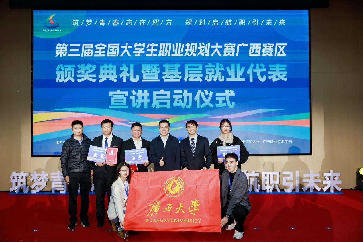 1月10日至11日,第三届全国大学生职业规划大赛广西赛区(高教组)现场总决赛在南宁师范大学(明秀校区)举行,经过激烈角逐,我校参赛选手刘涛、刘士领分别获得就业赛道(研究生组)金奖,文泺莹获得成长赛道银奖。