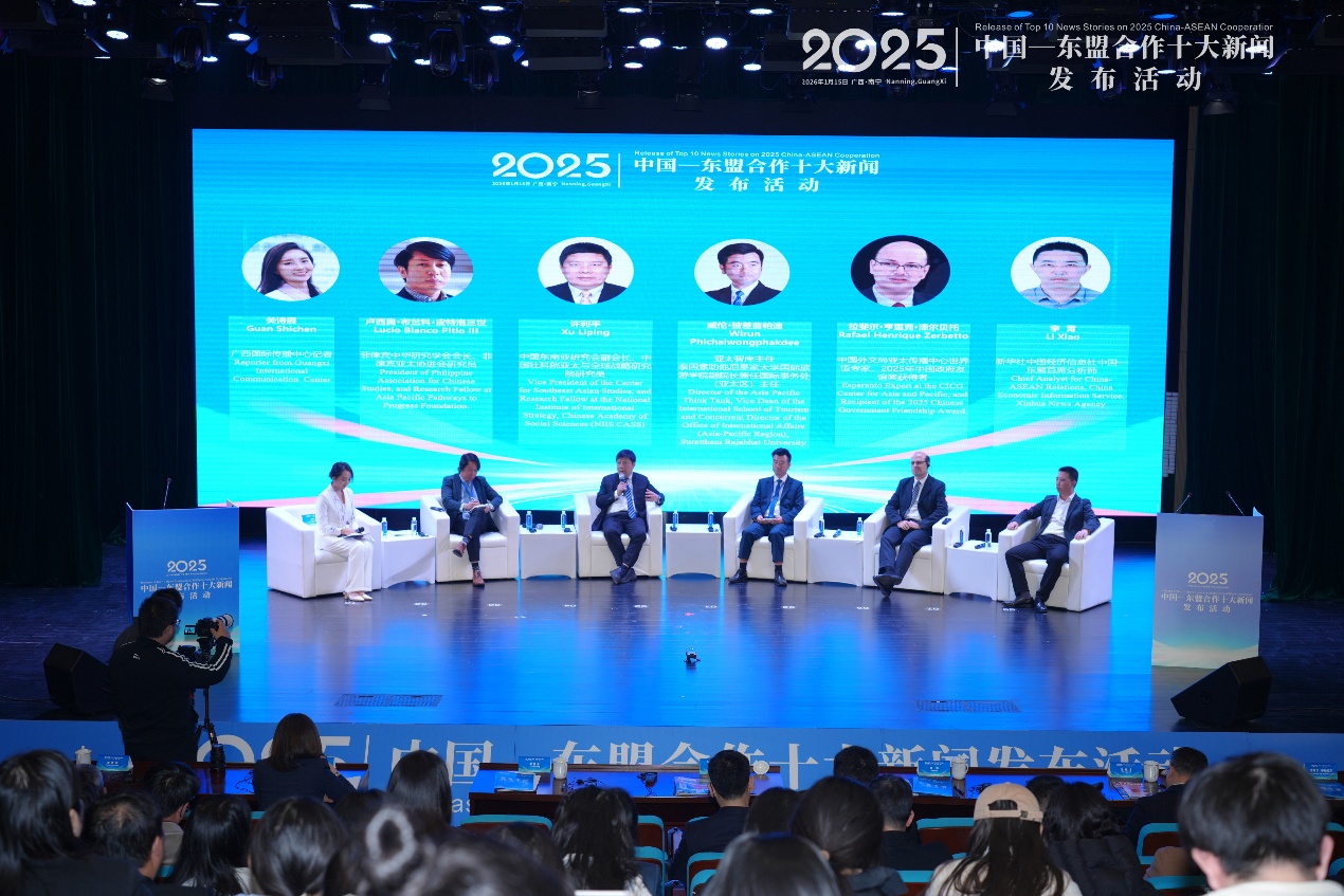 在圆桌对话环节,菲律宾中华研究学会会长、菲律宾亚太协进会研究员卢西奥·布兰科·皮特洛三世,中国东南亚研究会副会长、中国社会科学院亚太与全球战略研究院研究员许利平,泰国泰中“一带一路”研究中心主任威伦•披差翁帕迪,中国外文局亚太传播中心世界语专家、2025年中国政府友谊奖获得者拉斐尔·亨里克·泽尔贝托和新华社中国经济信息社广西经济研究中心负责人李霄等人围绕2026年中国—东盟合作前景的话题展开热烈讨论。