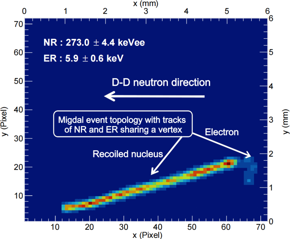 为破解这一难题,该团队创新性构建了中子束流实验体系,结合高颗粒度二维像素探测技术,成功捕捉到清晰的米格达尔效应信号。实验历时约150小时,最终从近百万个事件中筛选出6个符合标准的候选事件,统计显著性超过5个标准差,达到粒子物理领域“发现”的公认标准。团队还精确测量出米格达尔效应截面与原子核反冲截面的比值为(4.9±1.9/+2.6)×10^-5,与3.9×10^-5的理论预测在误差范围内保持一致,为该效应在暗物质实验中的可靠性提供了坚实数据支撑。