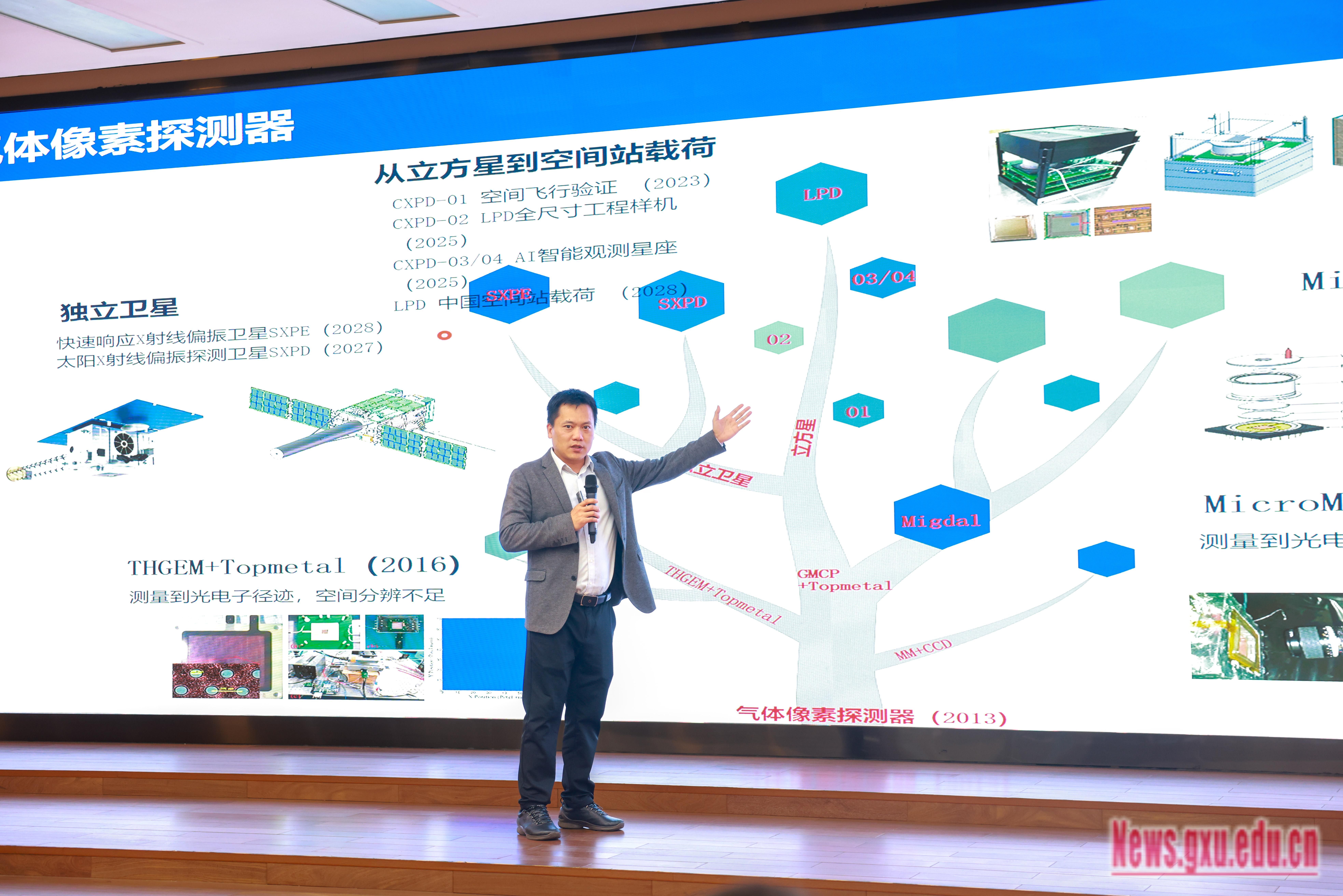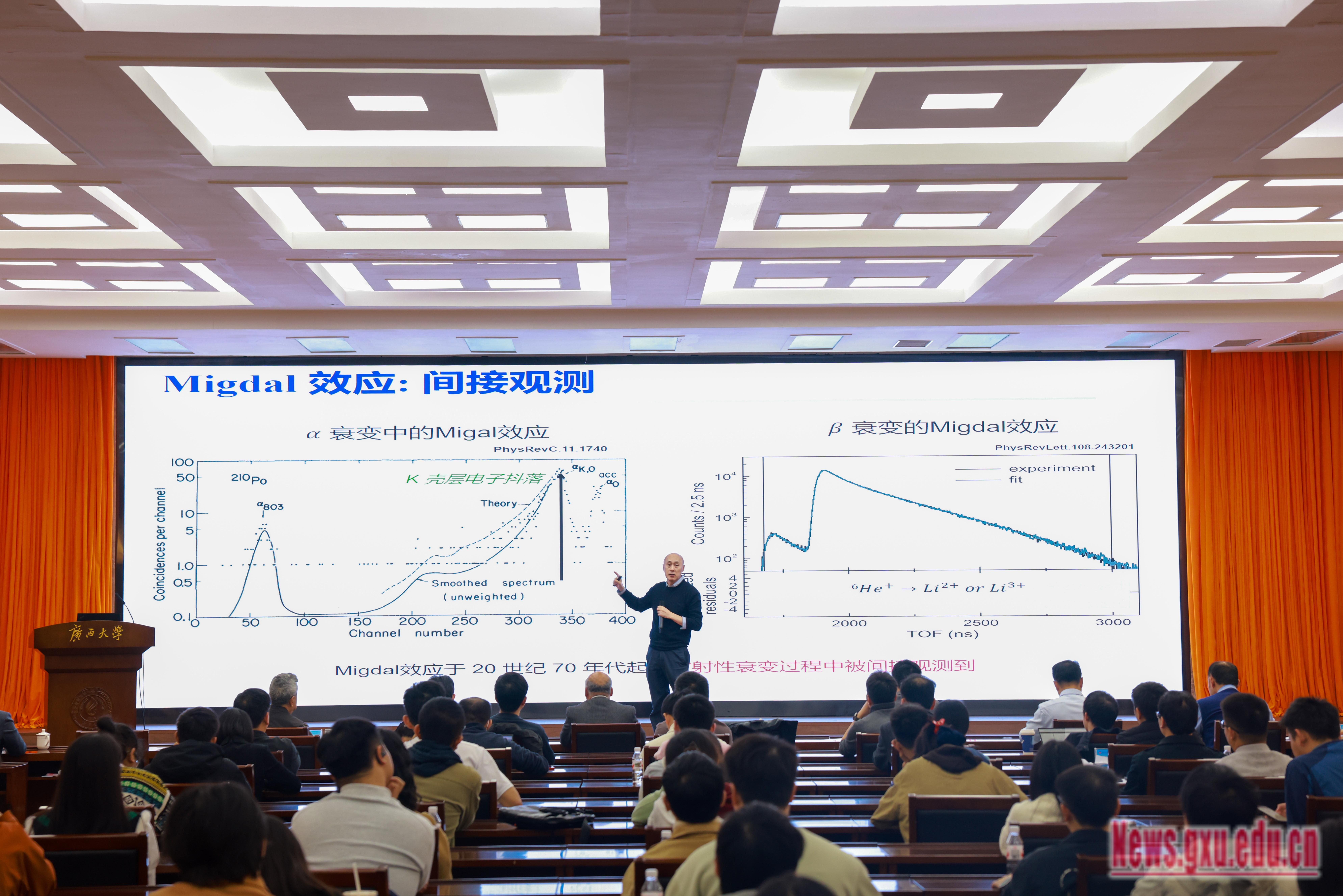 郑阳恒作题为“Migdal效应观测简介”的报告。他在报告中指出,该成果的核心支撑源于三大关键创新:一是由广西大学物理学院刘宏邦团队开发的微结构气体探测器,结合华中师范大学孙向明教授团队提供的像素读出芯片,组成了超灵敏探测装置,相当于可拍摄“单原子释放电子过程”的“科学相机”;二是刘倩老师团队创新的实验方法为精准观测提供了技术保障;三是南京师范大学相关团队扎实的理论对比工作为实验结果提供了坚实的理论支撑。此外,兰州大学为项目提供了中子源支持,多方协同完成了这一世界级科研突破。他介绍,目前团队正在为第二阶段实验做准备,将与暗物质直接探测团队合作,精确测量Migdal效应截面,并针对更多与暗物质实验相关的内容进一步开展Migdal截面的测量协作。