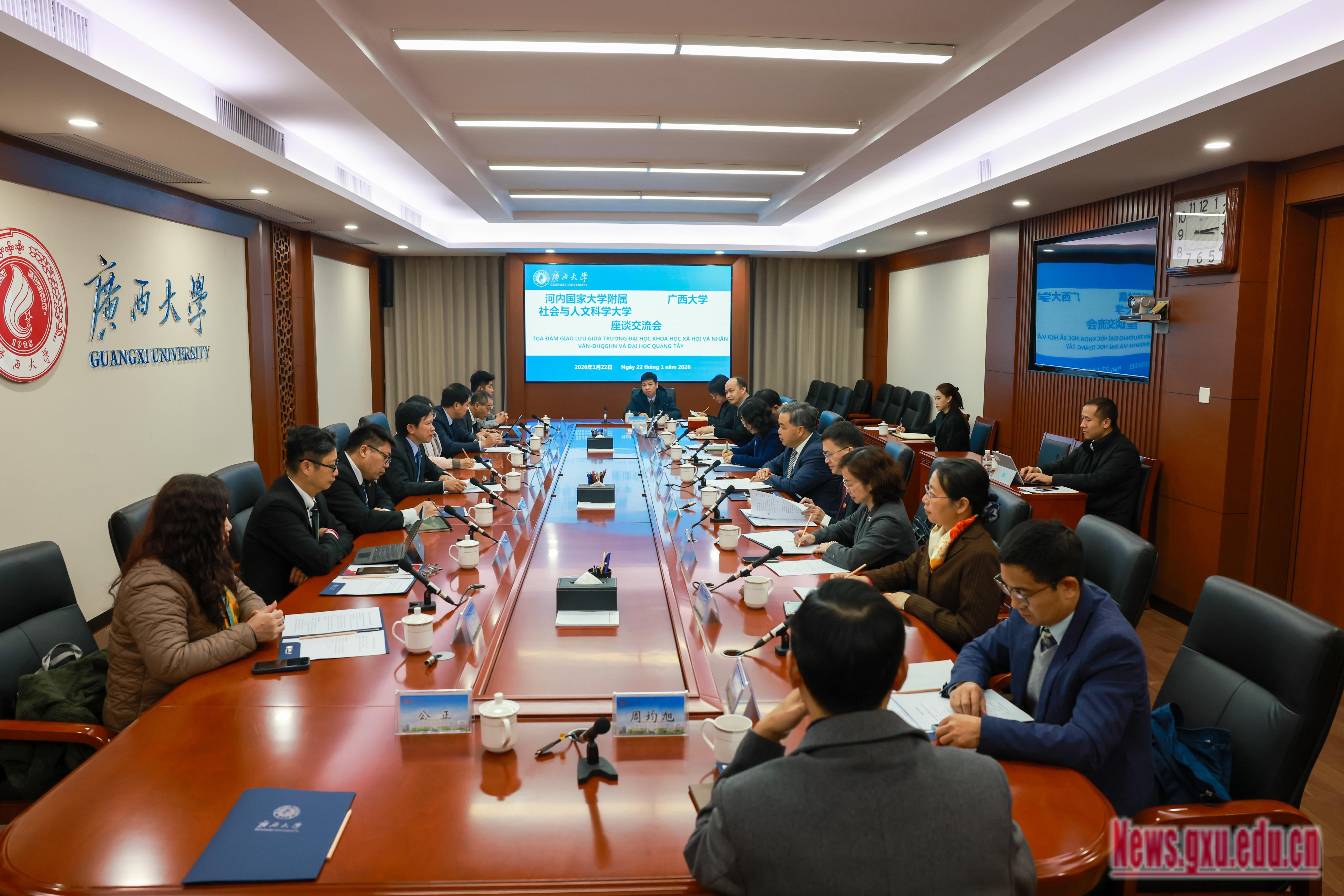 越南河内国家大学附属社会与人文科学大学科研、学报与对外处,人事处,民族与人类学系,政治系,东方学系,语言学与越南学系负责同志;我校教务处、国际合作与交流处、文学院、新闻与传播学院、外国语学院、公共管理学院、工商管理学院、马克思主义学院、中国—东盟经济学院相关负责同志参加活动。