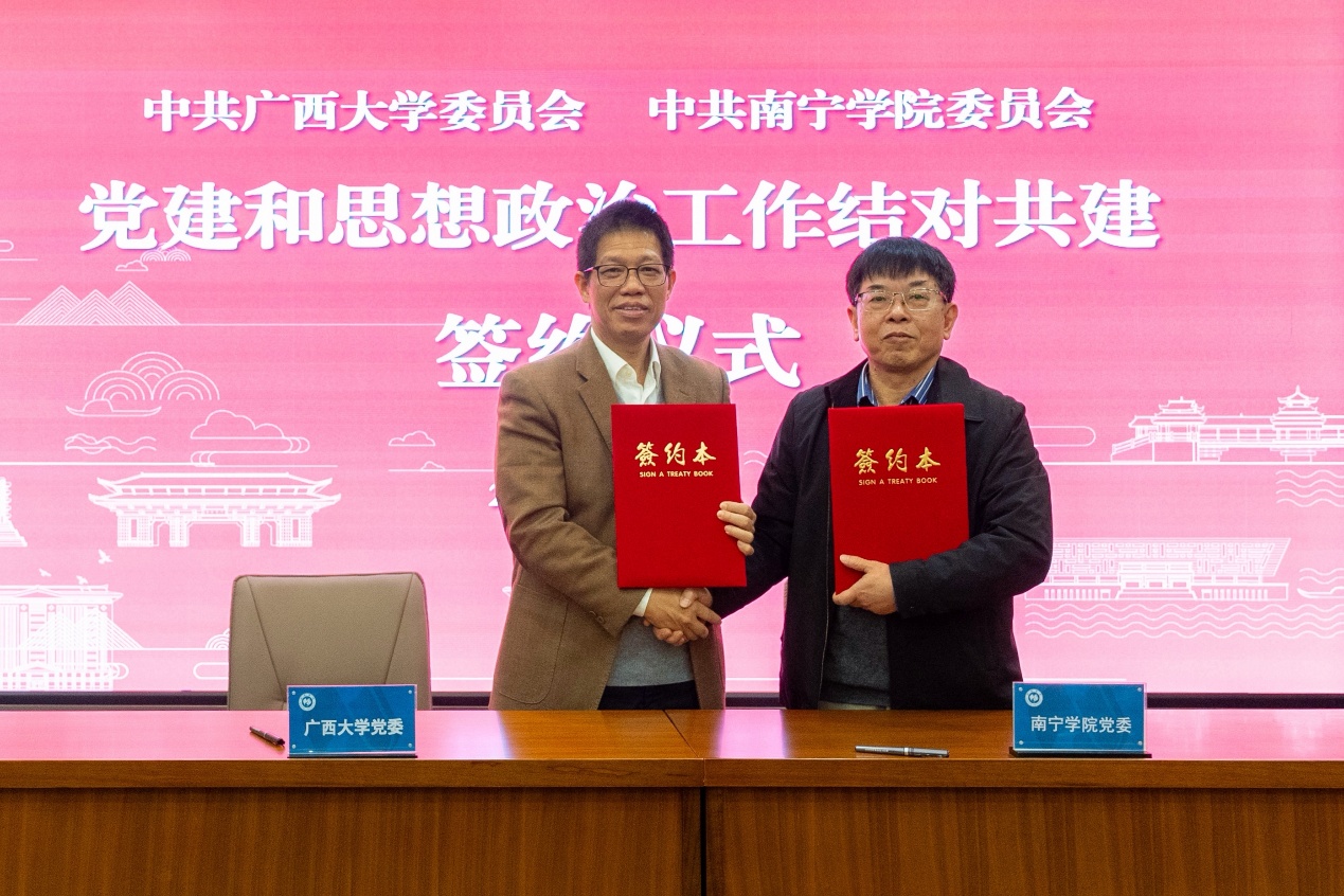 双方签署了《广西大学与南宁学院党建和思想政治工作结对共建协议(2025—2028年)》,明确了党务干部交流、思政教育建设、学科团队培育、资源共享等14项具体共建任务。