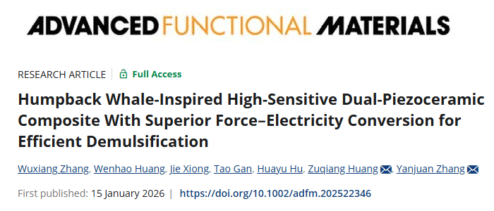 近日,我校化学化工学院天然高分子改性与生态功能材料团队在生态功能坭兴陶应用研究领域取得新进展,研究成果以“Humpback Whale-Inspired High-Sensitive Dual-Piezoceramic Composite With Superior Force-Electricity Conversion for Efficient Demulsification”为题发表在国际学术期刊Advanced Functional Materials上。该论文第一作者为化学化工学院2021级博士研究生张武相,通讯作者为化学化工学院教授黄祖强、张燕娟,广西大学是唯一完成单位。