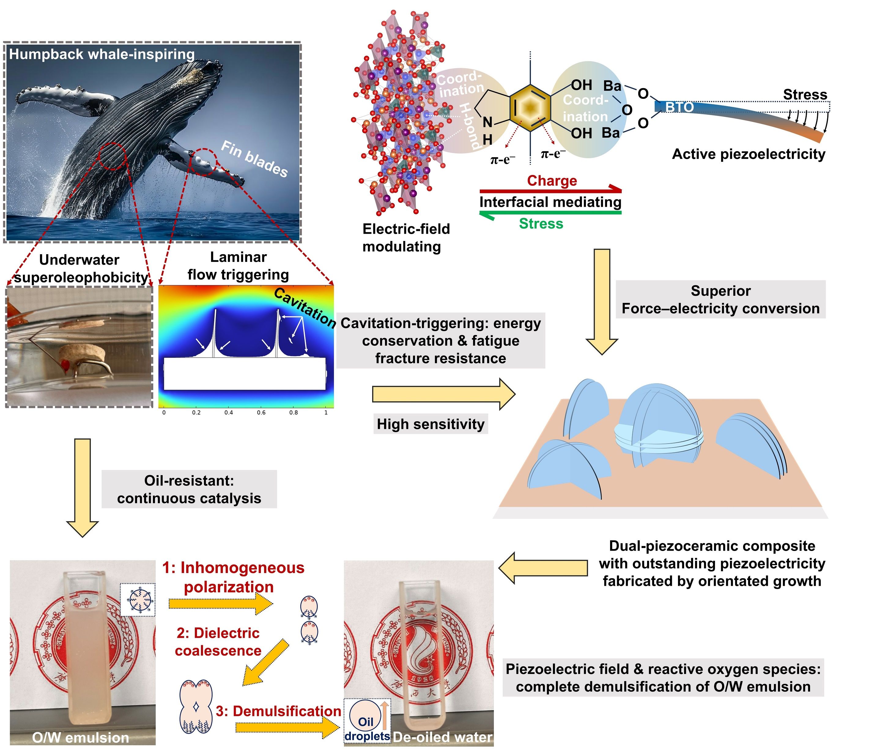 安全且可持续的压电催化技术在水体净化领域应用前景广阔,但压电陶瓷的固有刚性使实现卓越的压电催化效率颇具挑战,因为此过程需消耗大量能量,且压电陶瓷存在疲劳断裂的风险。基于此,该团队受座头鲸胸鳍前缘不规则结节在湍流中产生空化效应和流动涡的启发,以具有自发极化性能的生态功能坭兴陶为基体材料,经聚多巴胺仿生修饰后定向生长钛酸钡,合成具有高力—电敏感性的超润湿双压电复合材料。该仿生复合材料在温和机械力触发下产生了关键空化效应,聚多巴胺的配位作用使生态功能坭兴陶与钛酸钡之间实现高效的应力与电荷传输,因而复合材料表现出卓越的压电响应,产生1.46×10⁹ V/m的压电局域电场和活性氧,从而避免了疲劳断裂与高能耗。以普通搅拌为机械力,在15分钟内通过电场极化油滴和活性氧降解乳化剂实现了水包油乳化液的完全破乳,其性能优于对比催化剂3.3至4.0倍。这种策略实现了可持续且高效的破乳,在大规模含油废水的净化处理中展现出巨大的应用潜力。