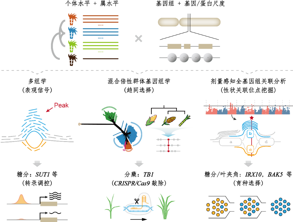 研究团队进一步提出 DosageGWAS 方法,作为解析多倍体中剂量效应的新策略,与传统线性方法相比,在遗传力估计与性状位点检出能力等方面均表现出明显优势,成功定位多个与糖分、叶夹角性状密切相关的候选基因,系统解析了糖分代谢等重要农艺性状的遗传基础。高粱族跨物种比较揭示了甘蔗与高粱在碳水化合物代谢与激素响应通路上的趋同选择现象。通过 CRISPR 功能验证,明确 TB1为甘蔗分蘖的关键功能基因,高效敲除系表现出显著更多分蘖、提前分蘖启动并伴随产量提升。清晰展示了从“图谱发现”到“功能验证”再到“育种靶点明确”的完整闭环。