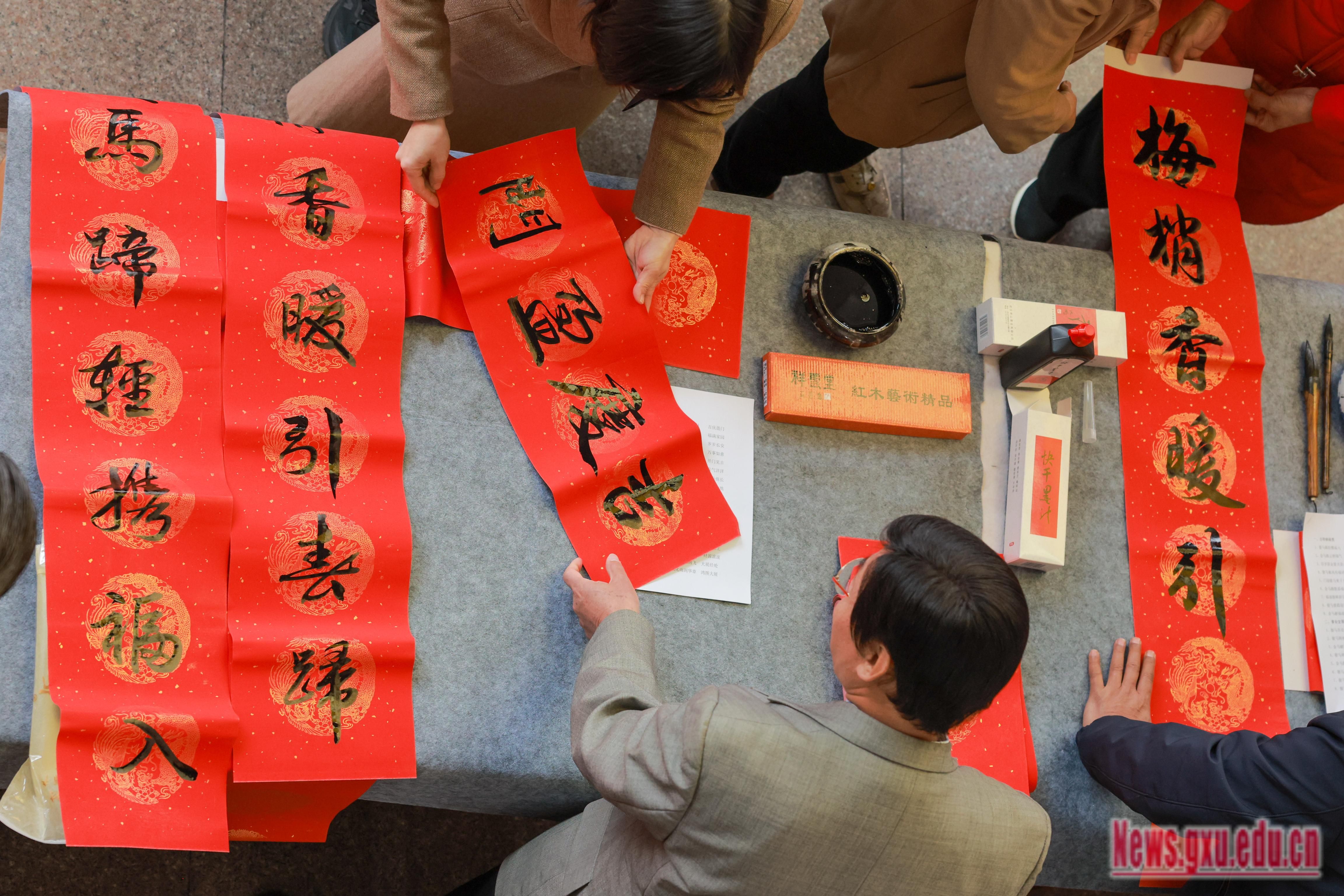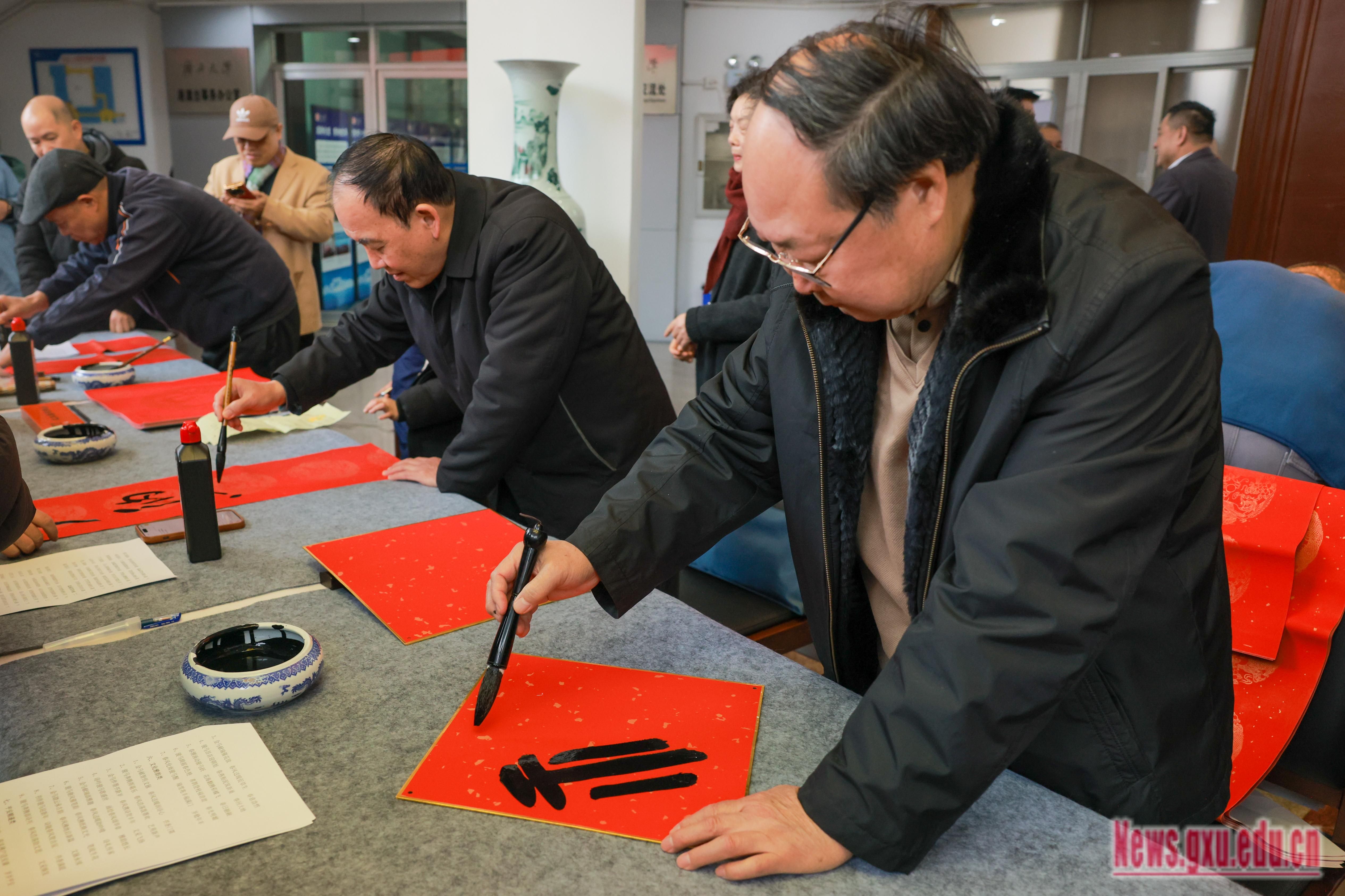 自治区高院原院长罗殿龙、自治区政协原副主席苏道俨、自治区科协原党组书记甘向群、高校工委原副书记秦敬德、自治区区直工委副书记邓金玉、自治区应急厅一级巡视员李明凤、广西日报原副总编梁锡训、广西书法家协会副会长李翔峰,广西大学艺术学院原院长帅民风、退休教授张明学、退休教授翟旭民等老领导、老教师现场挥毫泼墨书写春联和“福”字数百幅,为广大师生送上浓浓的新春祝福。活动现场还同时开展了中华传统文化表演、猜谜抽奖等配合活动来活跃气氛,300余名师生员工参加活动。