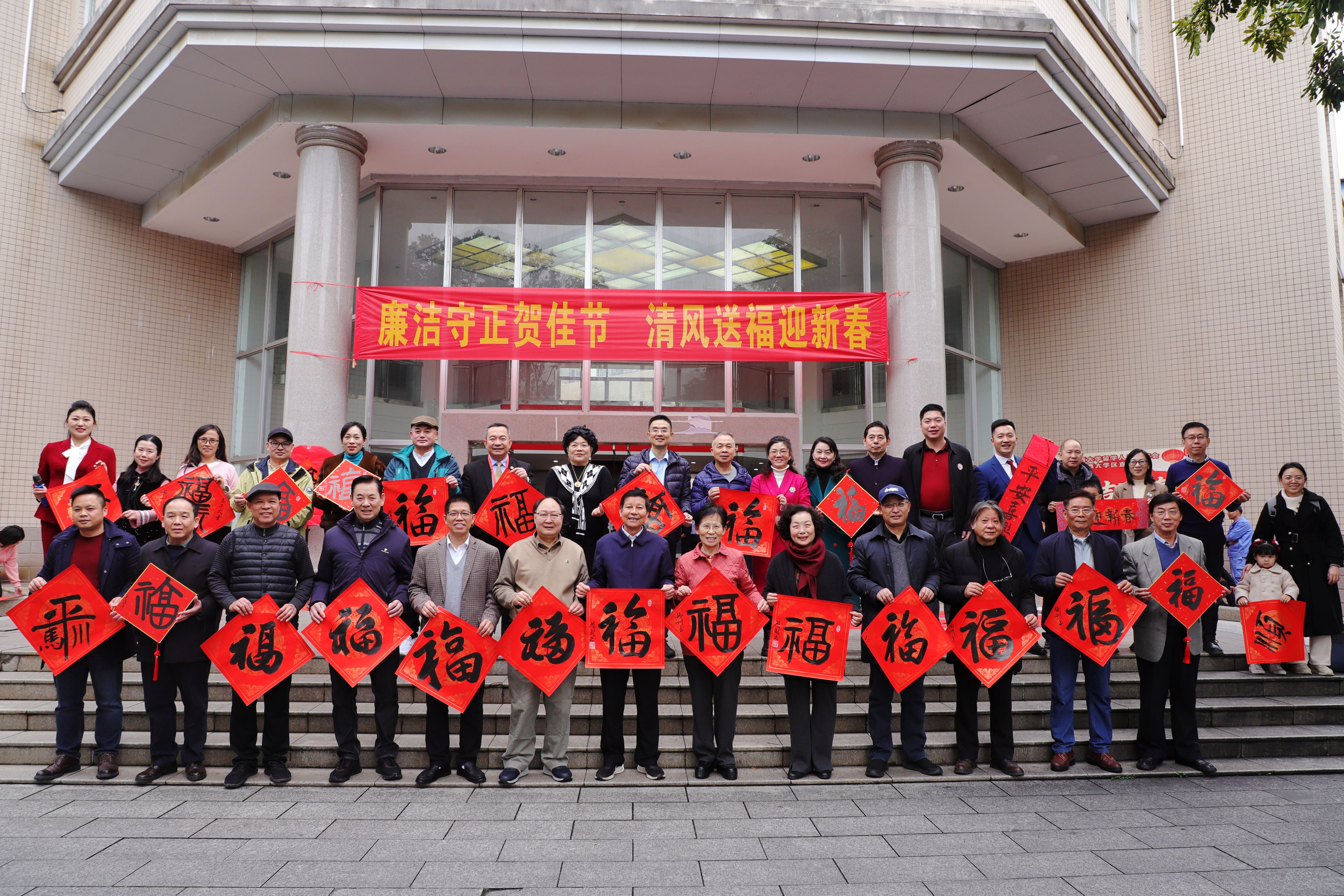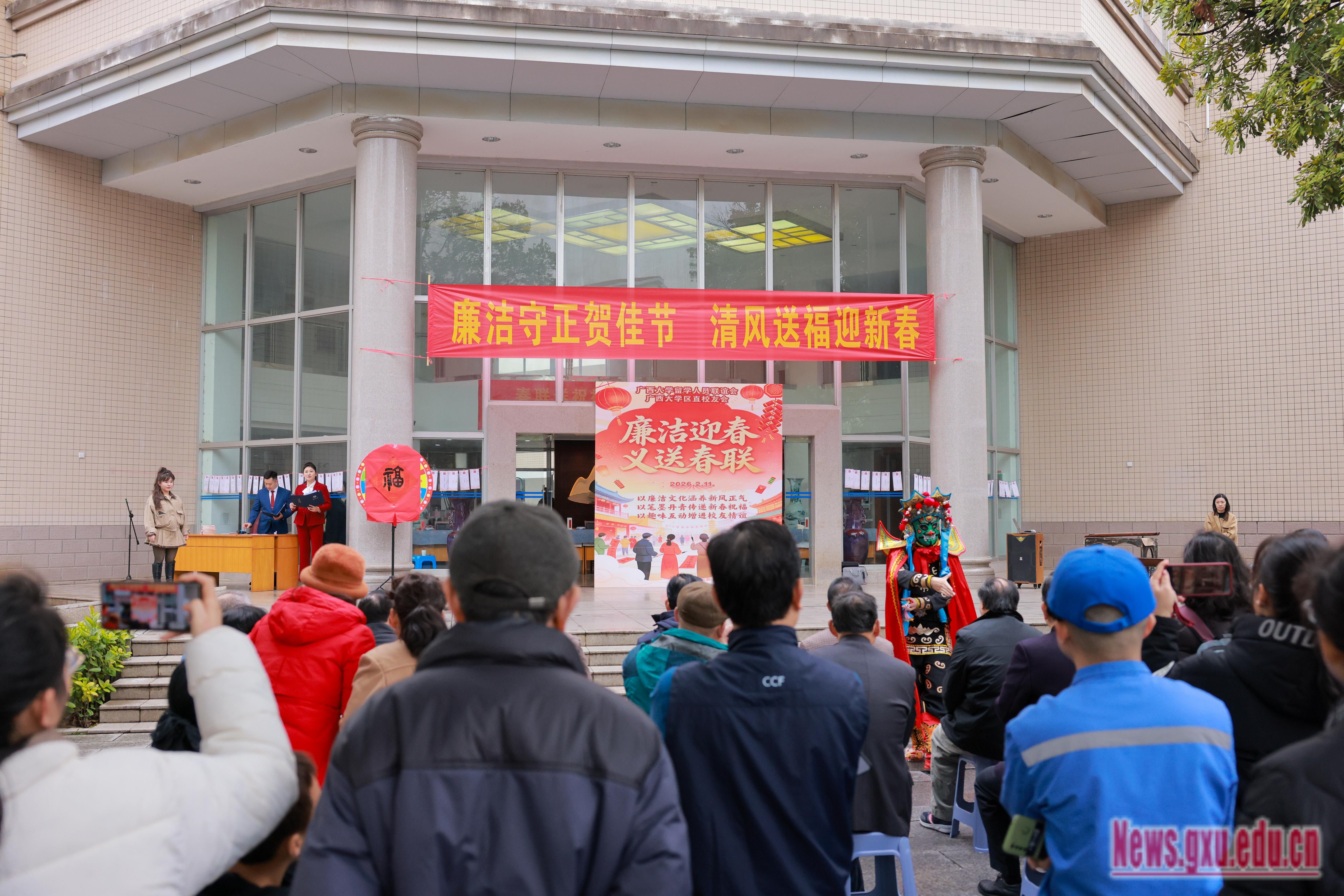 2月11日,由我校党委统战部、工会主办,校留学人员联谊会、区直校友会承办的“春联送祝福 墨韵启新程”活动在君武馆一楼大厅举行。校党委副书记宁旭初,广西大学区直校友会会长、自治区科协原党组书记甘向群出席活动并致辞。广西欧美同学会副会长、广西大学留联会会长、原副校长冯家勋,学校党委常委、统战部部长姚作芳出席活动。