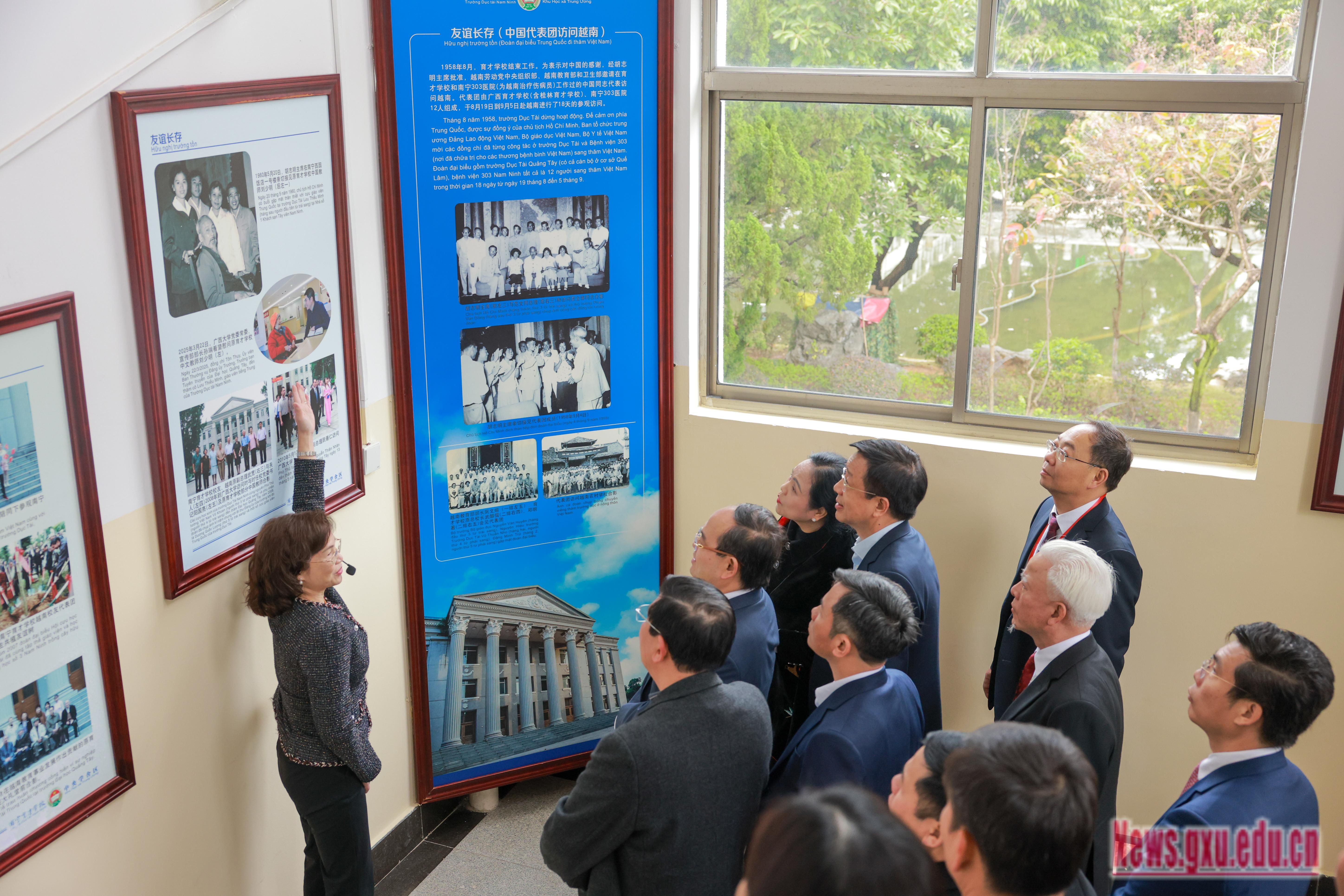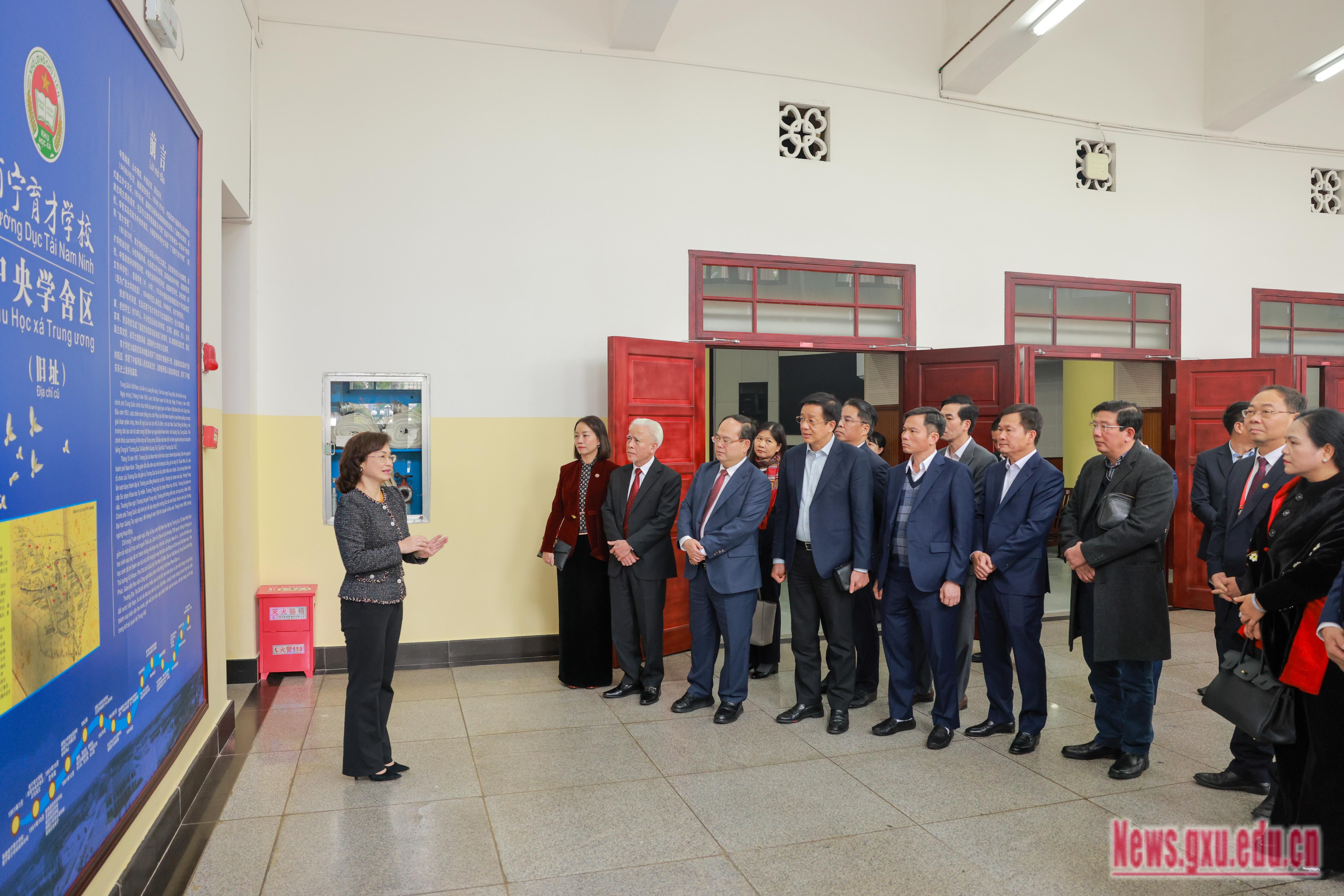 代表团一行在广西大学大礼堂(原南宁育才学校教舍),听取了其办学历史情况介绍,观看了主题为“育才缘•中越情”的图片展,深入了解了新时代广西大学与越南教育交流情况和取得的合作成果。代表团高度评价了原南宁育才学校为越南培养大批革命和建设人才所作出的历史贡献,充分肯定广西大学传承“育才缘·中越情”的深厚历史底蕴,以及在对越教育交流与合作中取得的丰硕成果。希望今后继续与广西大学在人才培养、青年交流等方面深化合作,并诚挚邀请广西大学领导率团访问越南。