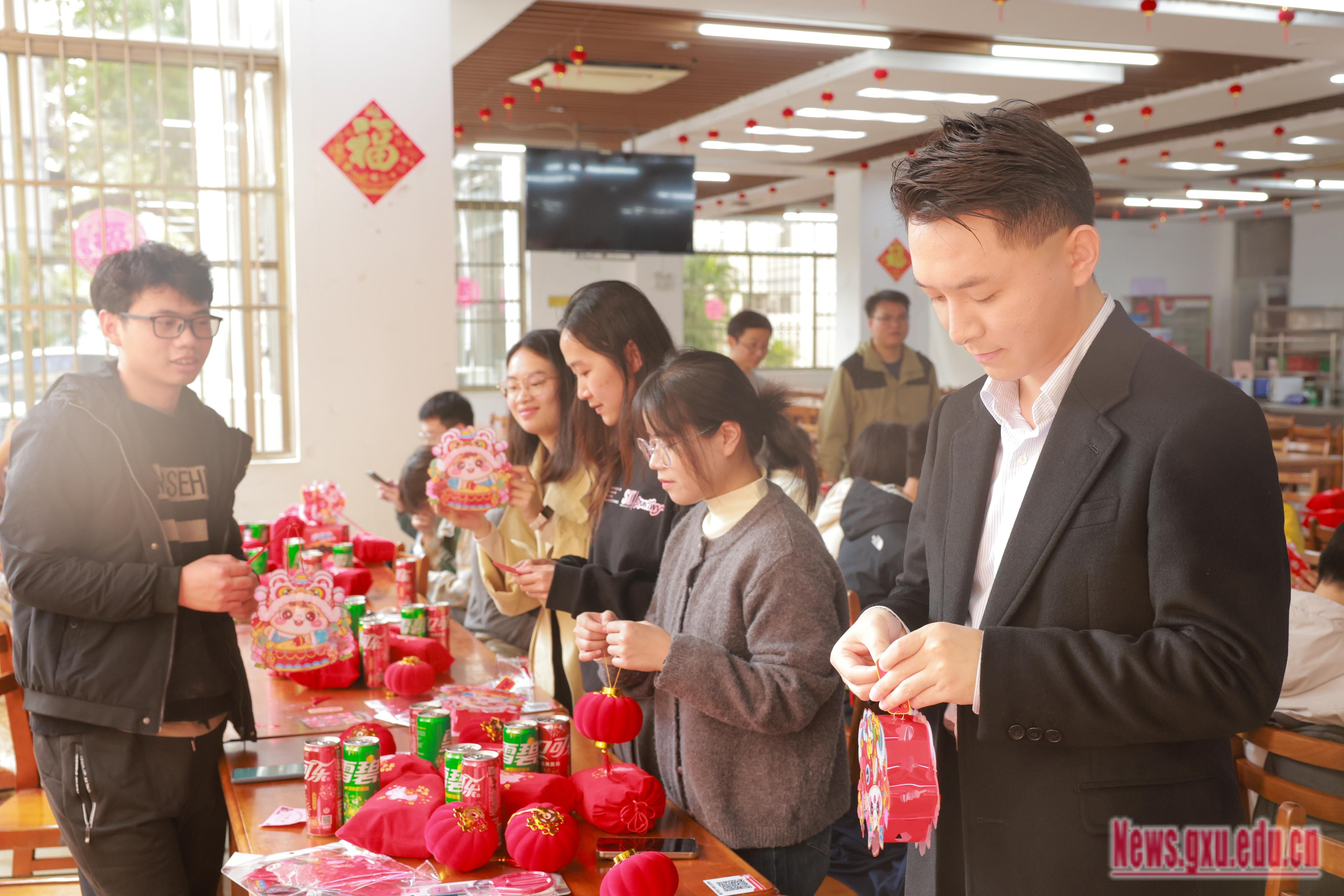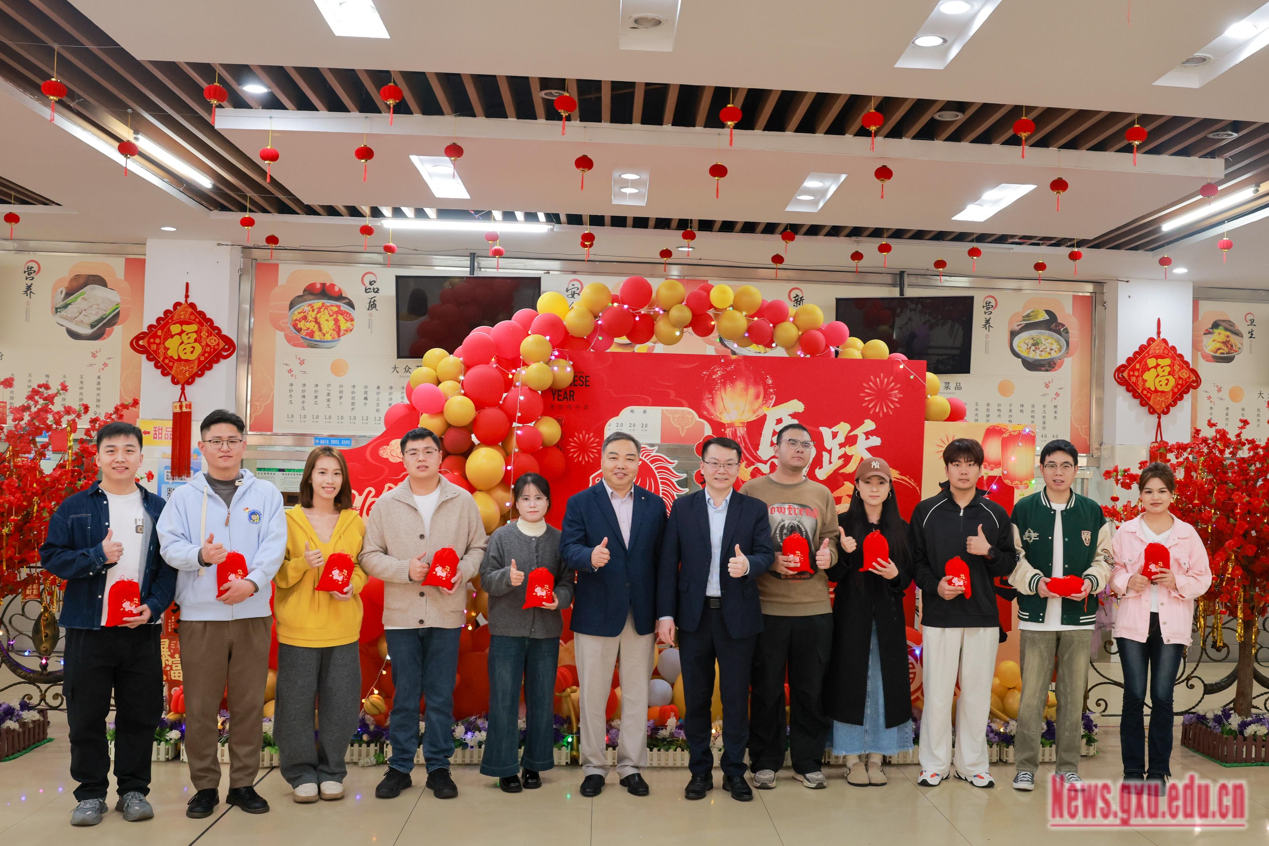 肖建庄和赵双良代表学校为留校过年的同学们送上“春节红包”和“福袋”。活动现场张灯结彩、笑语盈盈,洋溢着浓厚的节日气氛。