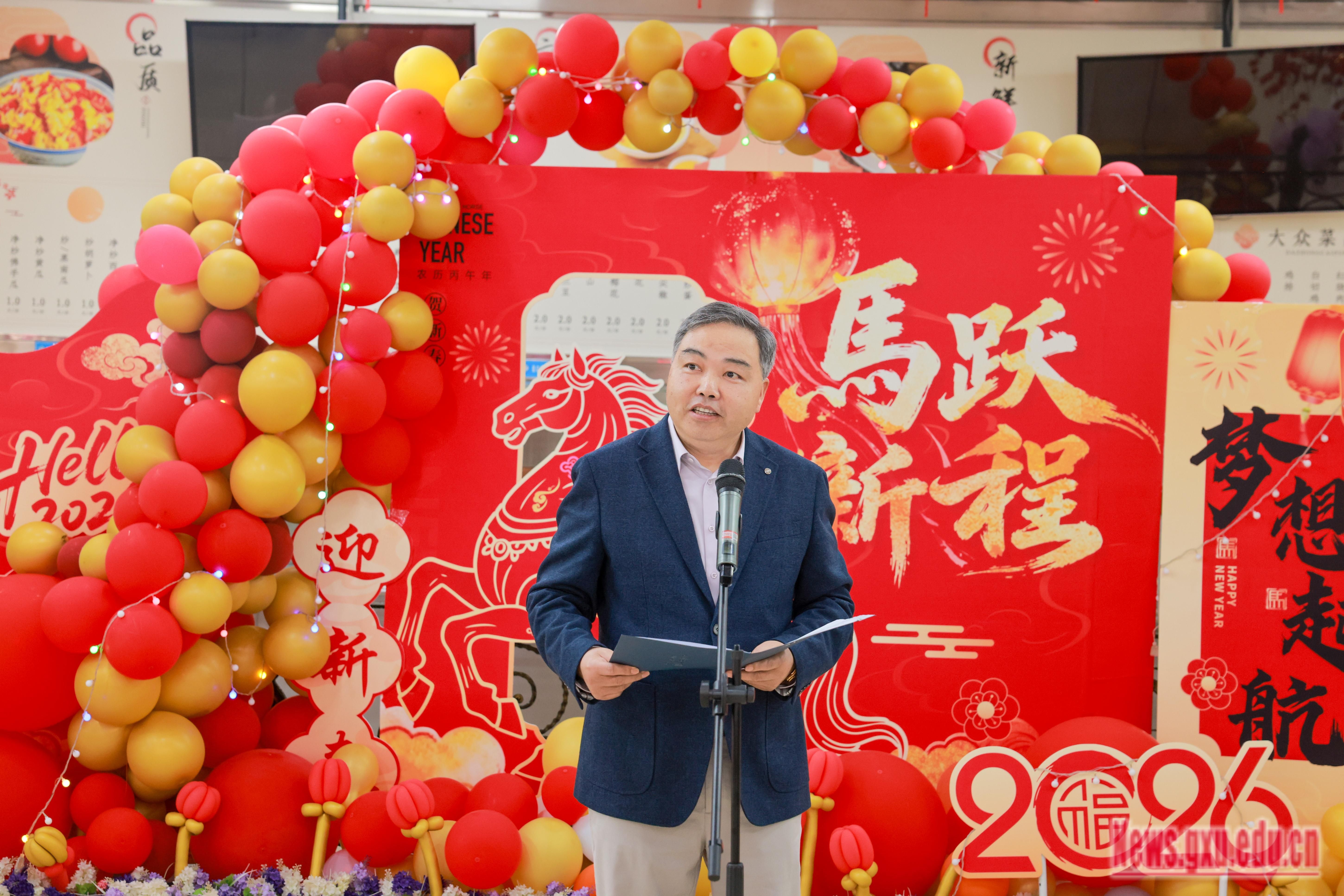 肖建庄向全体西大学子、教职工、离退休老同志和广大校友致以诚挚问候与新春祝福,他勉励同学们在马年争做新时代的“千里马”,既要立大志、明方向,也要勤学习、苦锤炼,以久久为功的坚韧走好每一步成长路,积蓄驰骋未来的底气;希望全体教师牢记育人使命,用爱心浇灌成长、用责任守护梦想。他号召全校师生员工发扬“老师拼命教,员工拼命干,学生拼命学”的“三拼”精神,在国家所需、广西所能、西大所为、未来所向的交汇点上精准发力,将学校党委擘画的“十五五”发展蓝图一步步变成现实。