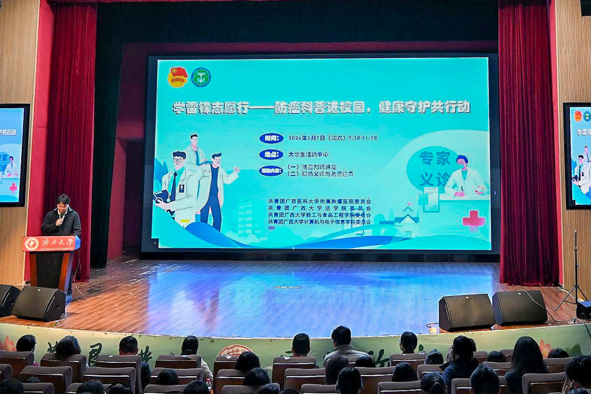 轻工与食品工程学院、法学院、计算机与电子信息学院联合广西医科大学附属肿瘤医院团委,在大学生活动中心举办“学雷锋志愿行——防癌科普进校园,健康守护共行动”主题公益活动。活动融合专业防癌宣讲、多维度健康科普、现场义诊咨询三大核心环节,将权威医疗知识、食品安全、卫生健康法律、网络信息辨别技巧送到青年学子身边,深化健康校园建设,让健康守护触手可及。