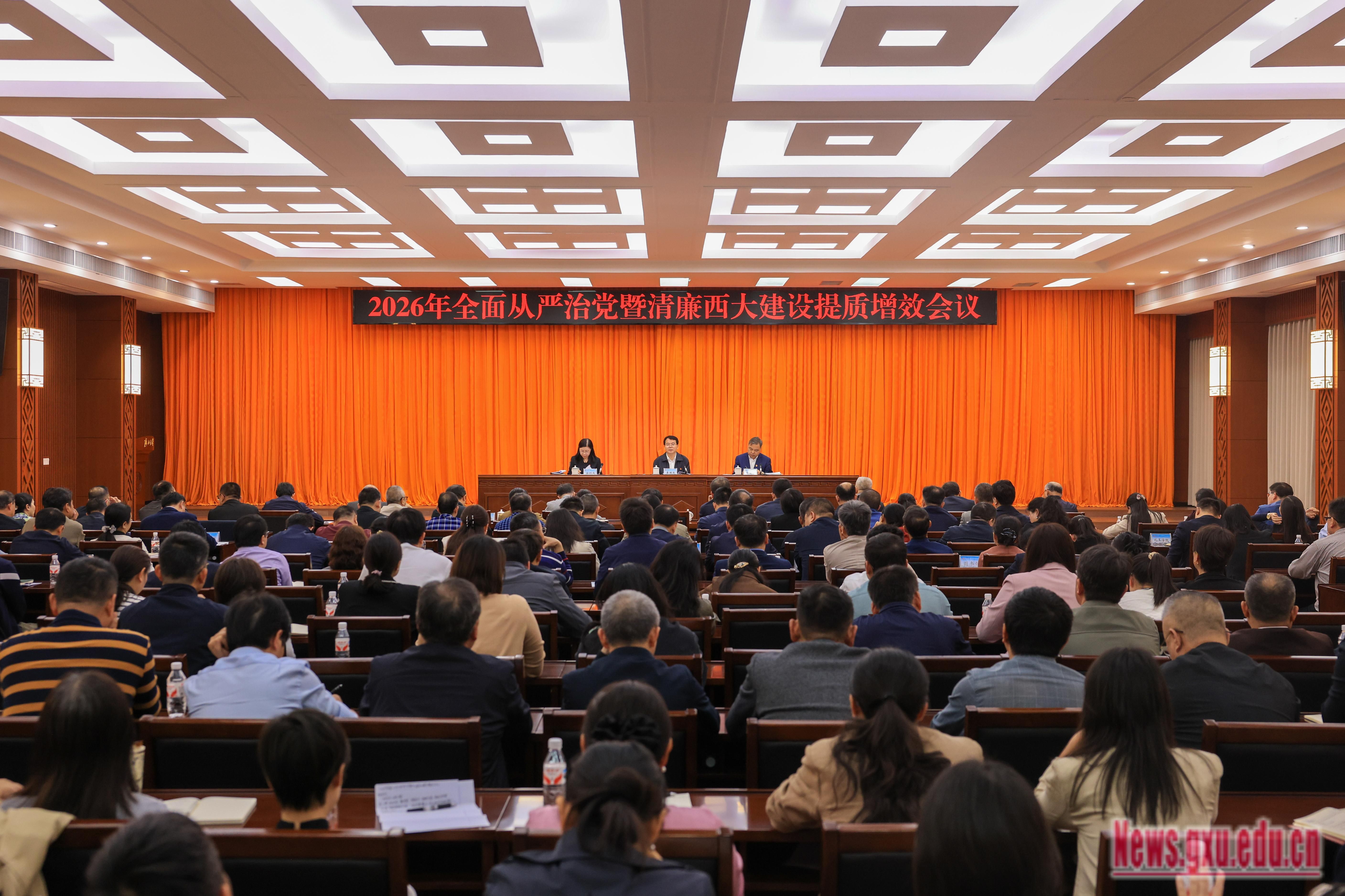 3月19日,我校召开2026年全面从严治党暨清廉西大建设提质增效工作会议,深入学习贯彻习近平总书记在二十届中央纪委五次全会上的重要讲话和全会精神,认真落实自治区纪委十二届六次全会精神和全国、全区教育系统2026年全面从严治党工作视频会议部署要求,总结2025年学校全面从严治党和清廉西大建设成效,分析当前形势,部署今年重点任务,为学校“十五五”规划开局起步、“双一流”建设提质增效筑牢政治根基、提供纪律保障。校党委书记李国忠出席会议并讲话。教育部高校党建工作联络员李继兵到会指导。校党委副书记、校长肖建庄主持会议。校党委副书记、自治区纪委监委驻广西大学纪检监察组组长、校纪委书记金顺南出席会议并讲话。