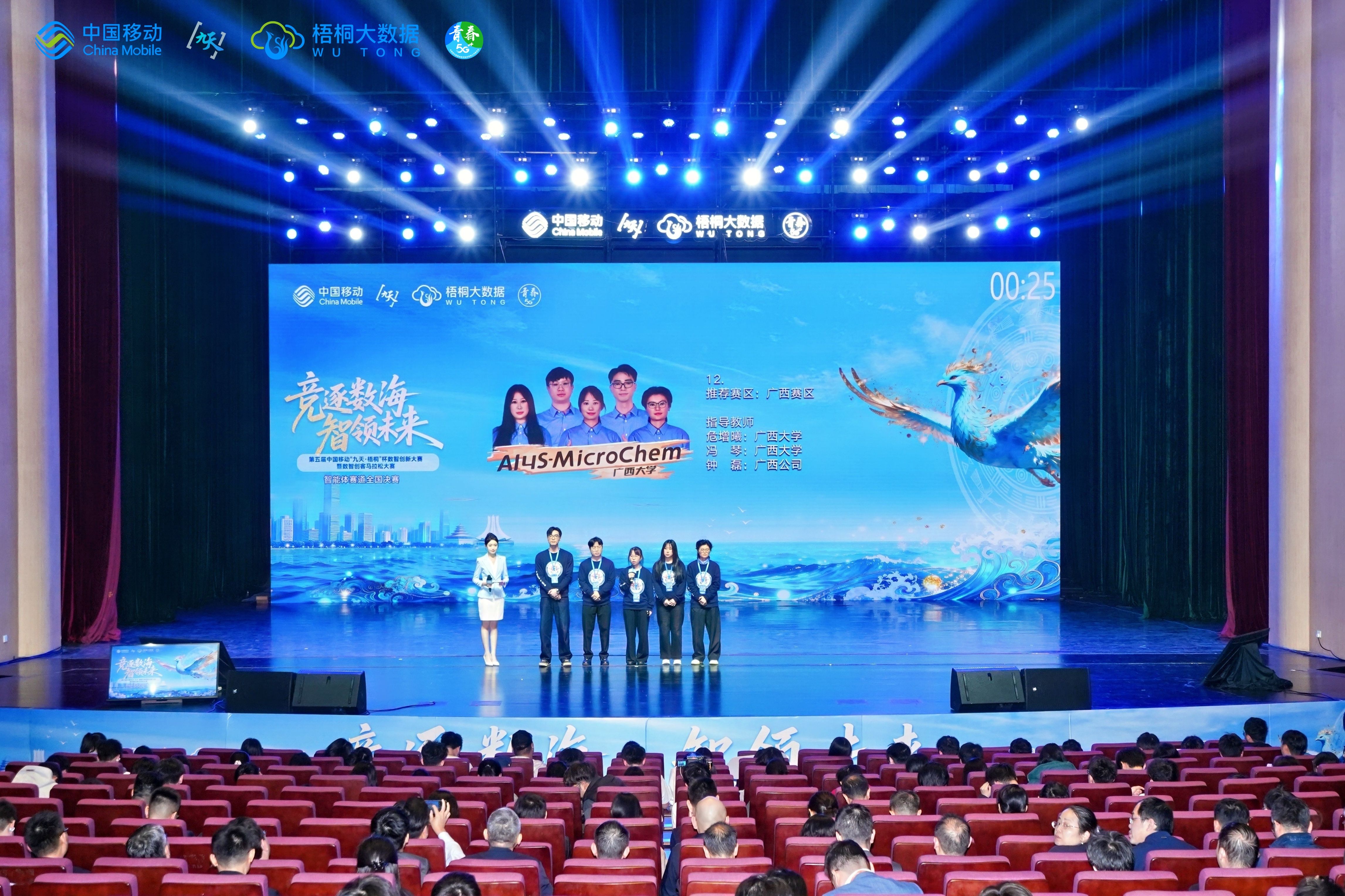 本次大赛开设智能体、AI+数据、AI+安全三大赛道,其中智能体赛道吸引了海内外818支团队参与。参赛者依托中国移动“九天·聚智”智能体平台,在安全、运维、文旅服务等五大方向开展了丰富的创新实践。大赛采用“数智风采展+项目实力秀”双环节赛制,来自海内外20所高校的18支精英团队同台竞技,另有1支国际邀请赛团队参与交流展示。经过激烈角逐,我校“AI4S-MicroChem”和“arike”两支团队荣获一等奖,成功晋级全国总决赛。