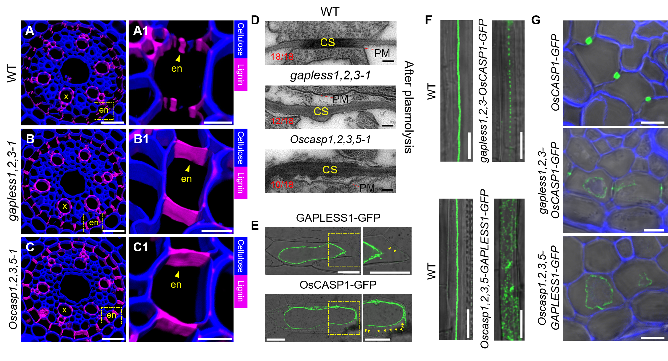 图1 木质素、GAPLESS1和OsCASP1在野生型、gapless1,2,3及Oscasp1,2,3,5突变体内皮层中累积与定位模式分析