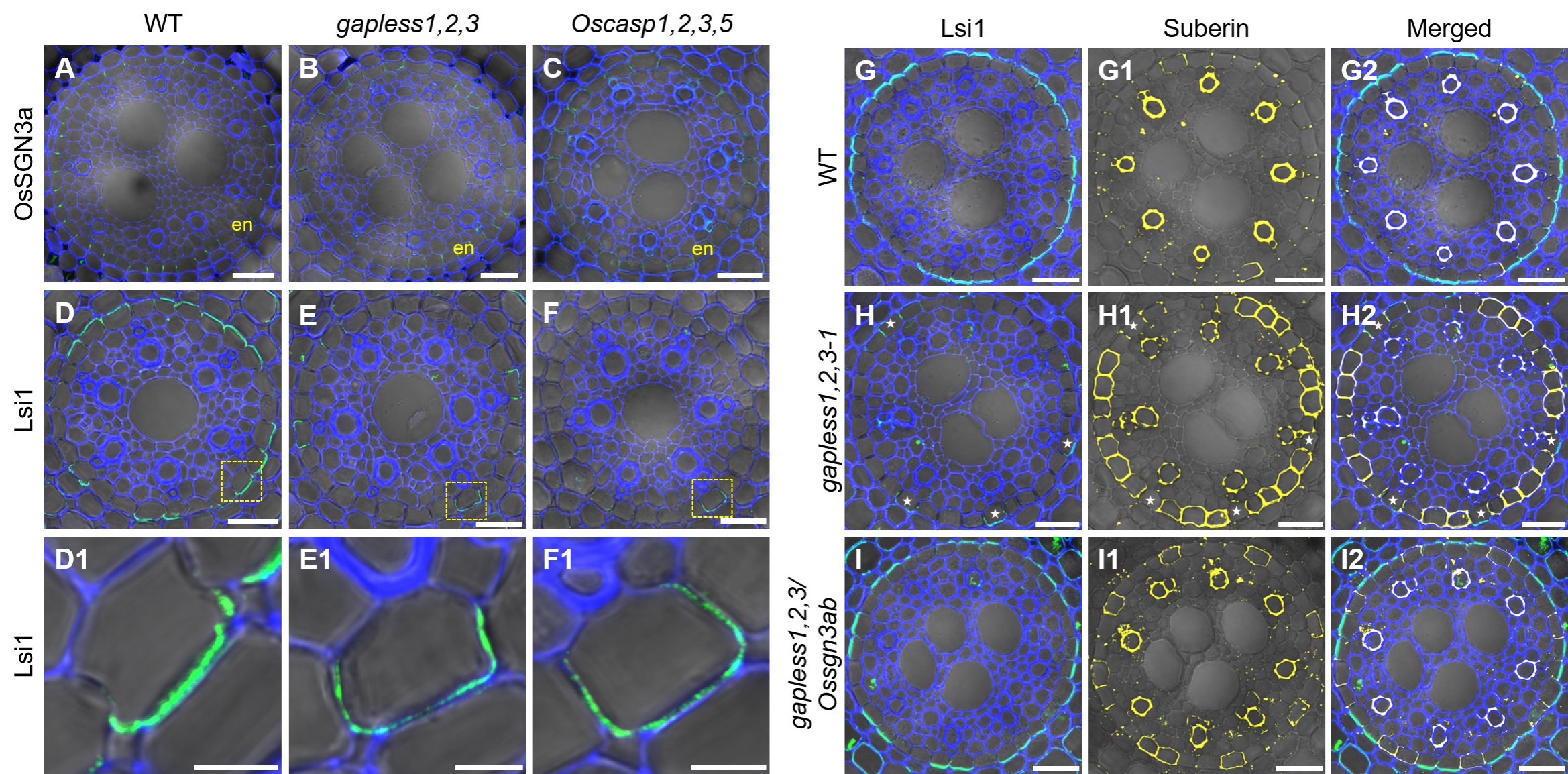 图2 OsSGN3a、Lsi1和木栓质在野生型、gapless1,2,3及 Oscasp1,2,3,5突变体内皮层中的定位与累积分析