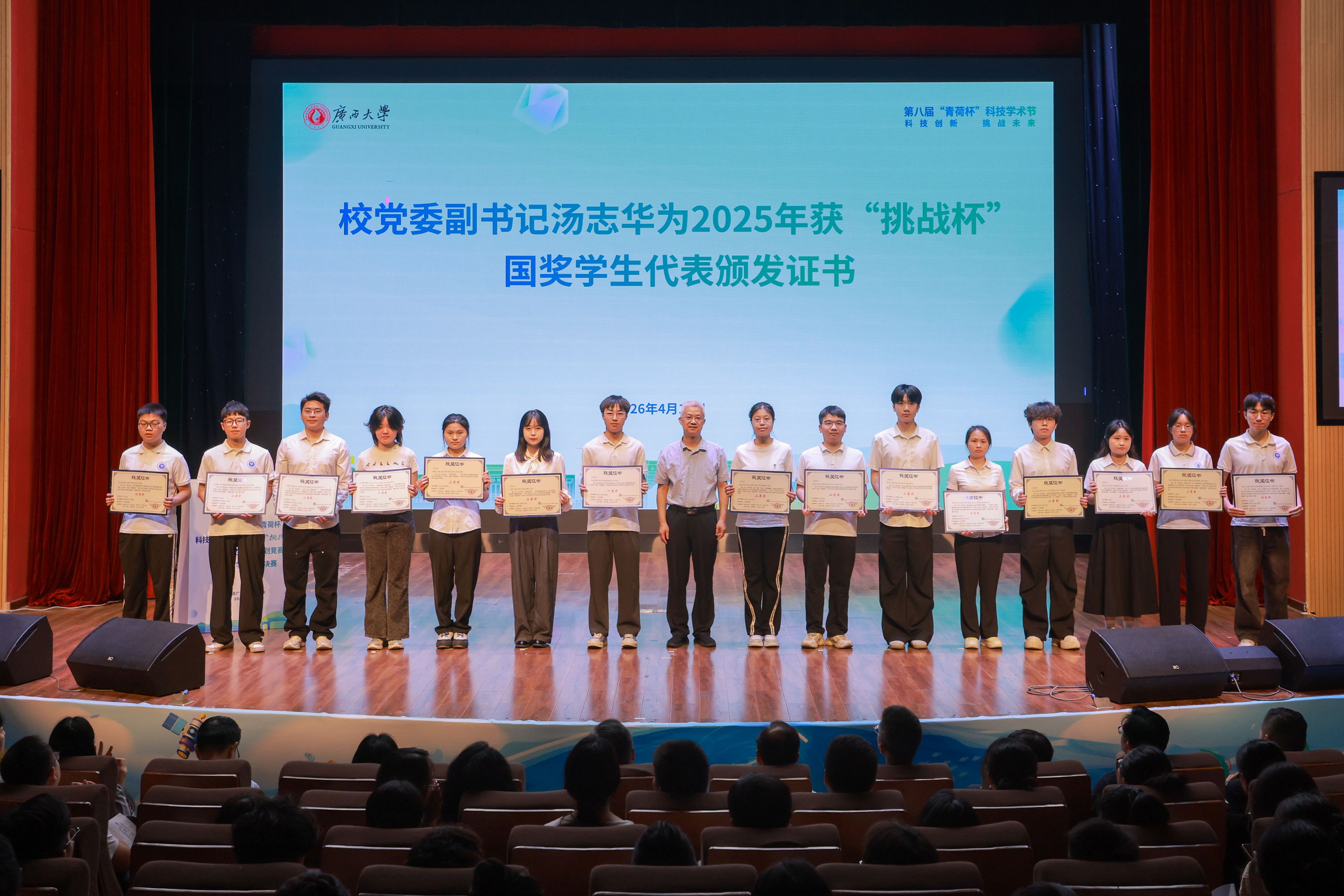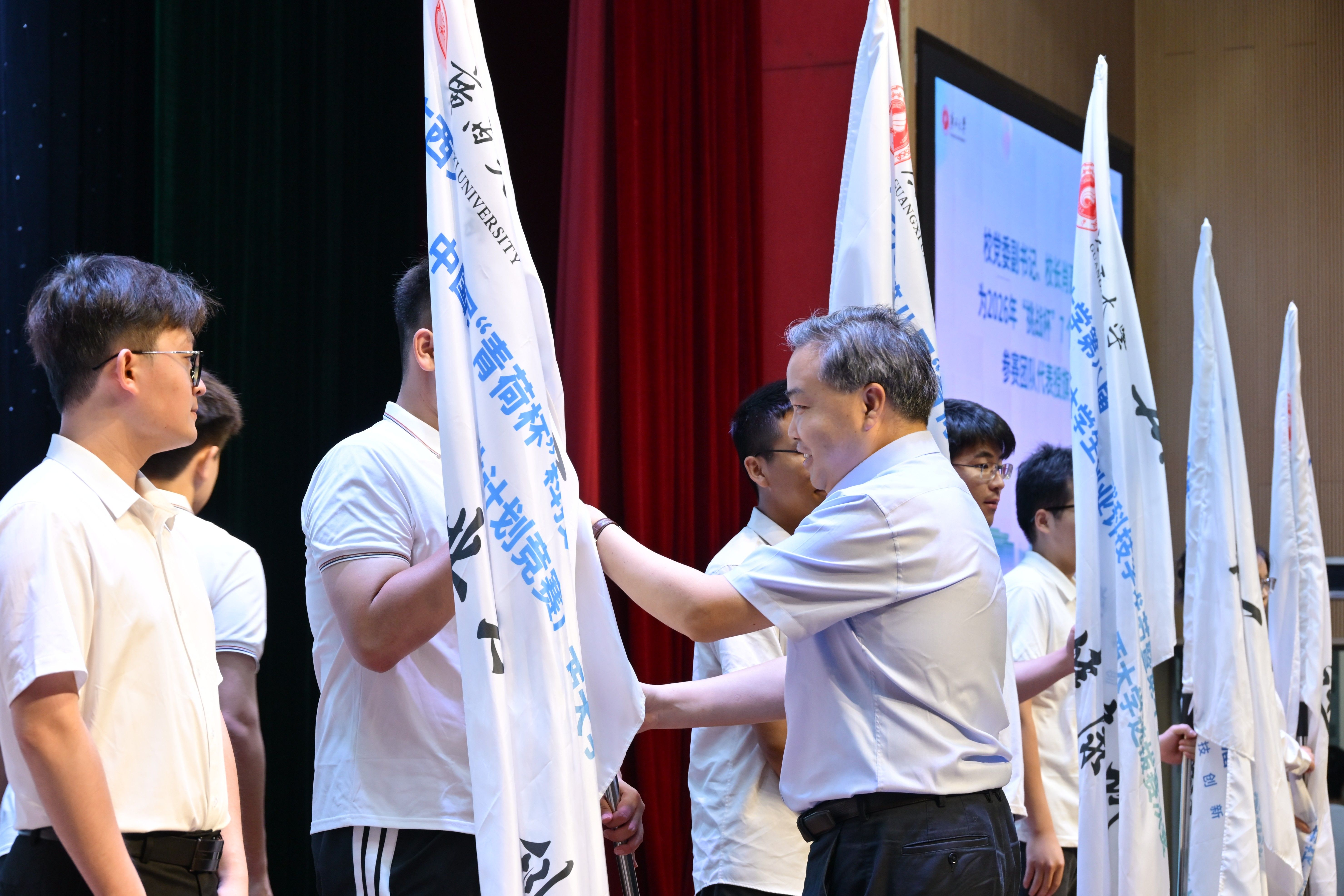 开幕式上,肖建庄为2026年“挑战杯”7个赛道参赛团队代表授旗,汤志华为2025年“挑战杯”国赛获奖学生代表颁发荣誉证书。