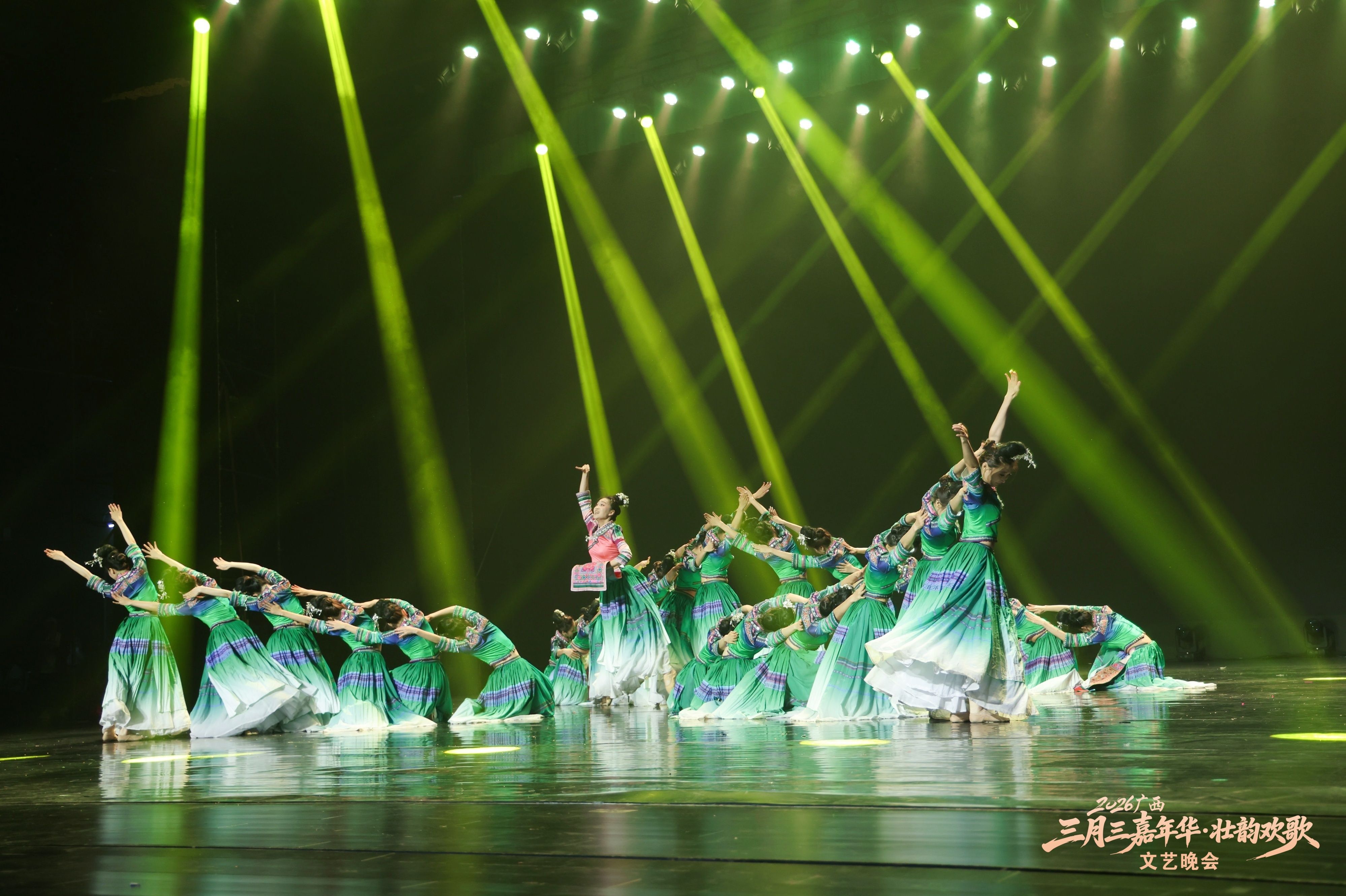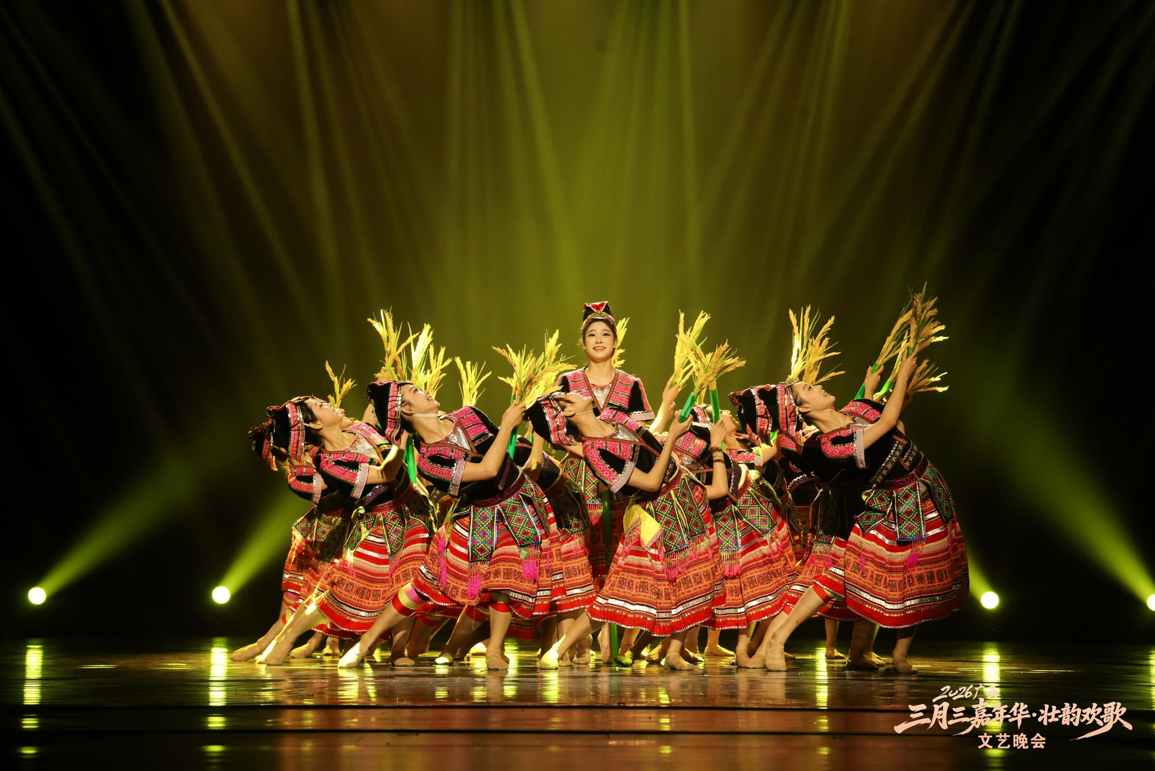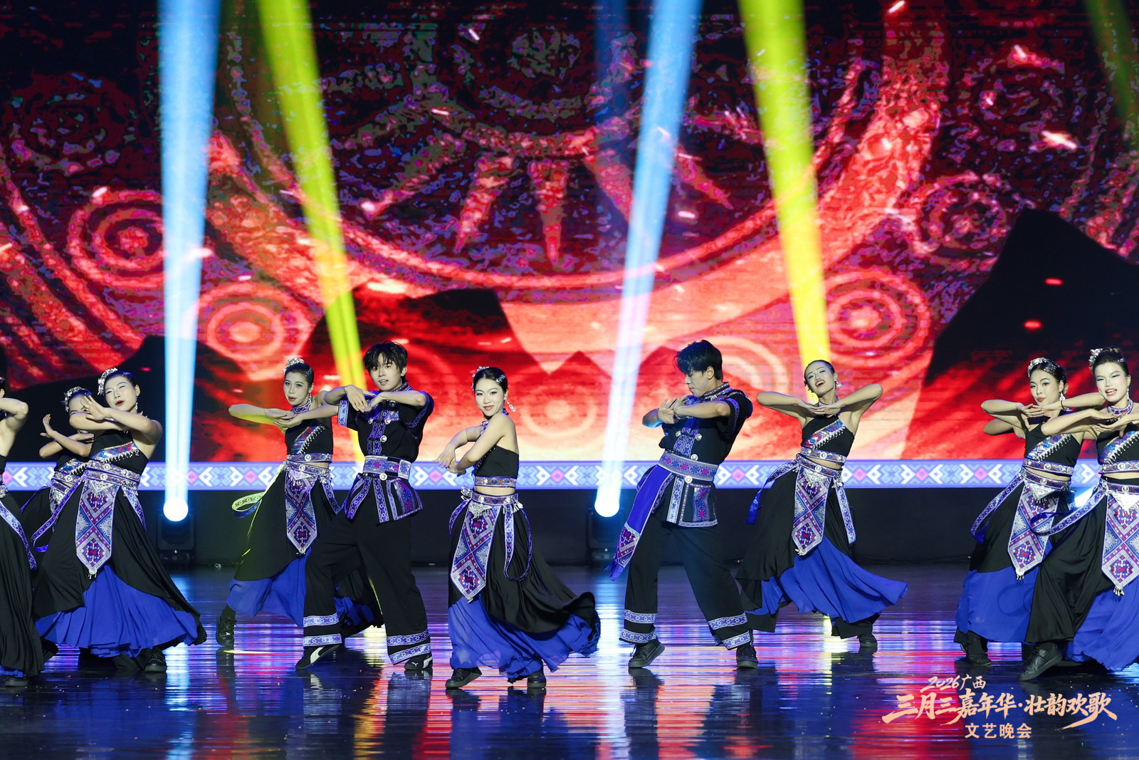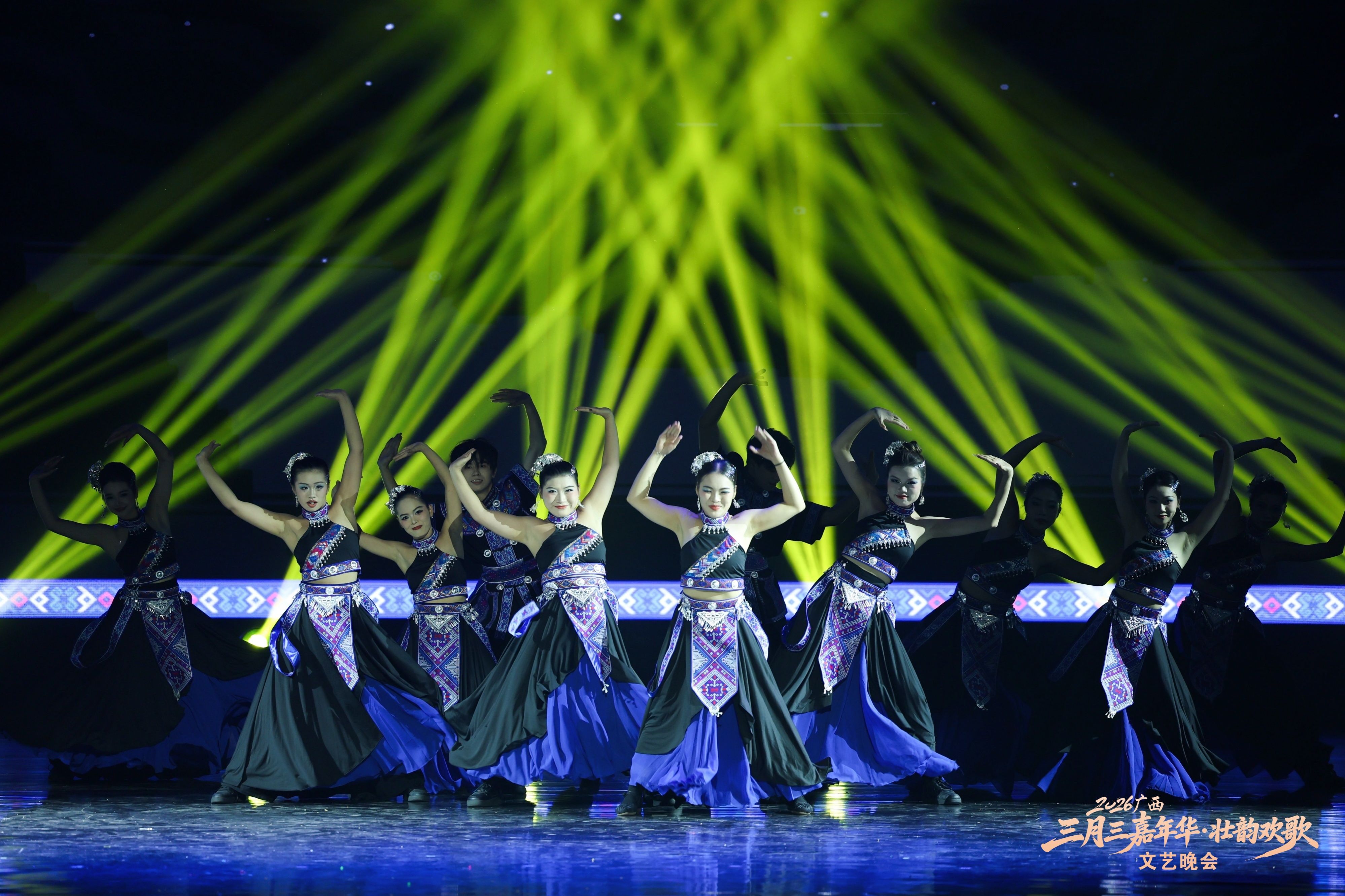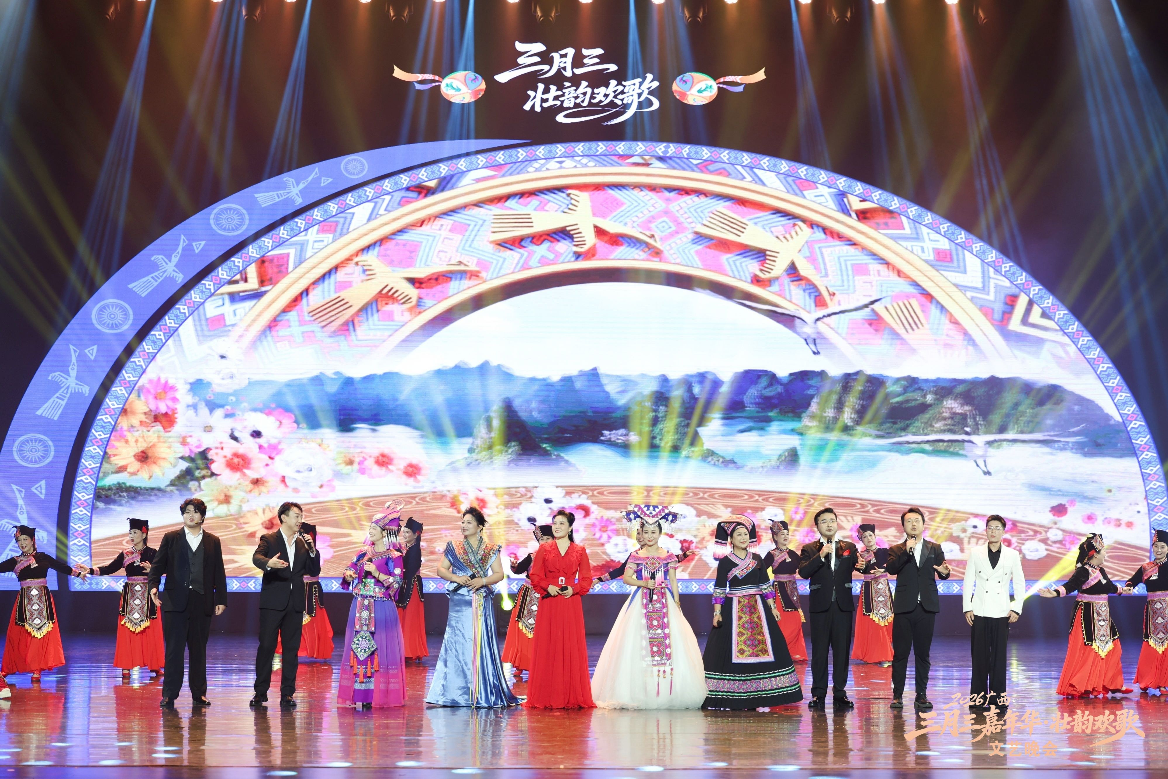 本次晚会汇聚八桂大地各民族文艺精品,共推出16个特色节目。开场民乐合奏《美丽壮锦》《达亨嘎》奏响壮乡锦绣画卷,京族独弦琴《过桥风吹》、壮族天琴弹唱《琴韵声声世代传》等非遗节目尽显八桂民族文化底蕴。街舞《迎》、靖西摇滚《朵嗨・醉月》以潮流形式焕活传统,碰撞出青春火花。《歌飞天下三月三》《新山歌好比春江水》等经典民歌轮番上演,《赶圩归来阿哩哩》以清脆的歌声再现壮乡儿女赶圩归来的幸福场景,将现场氛围推向高潮。