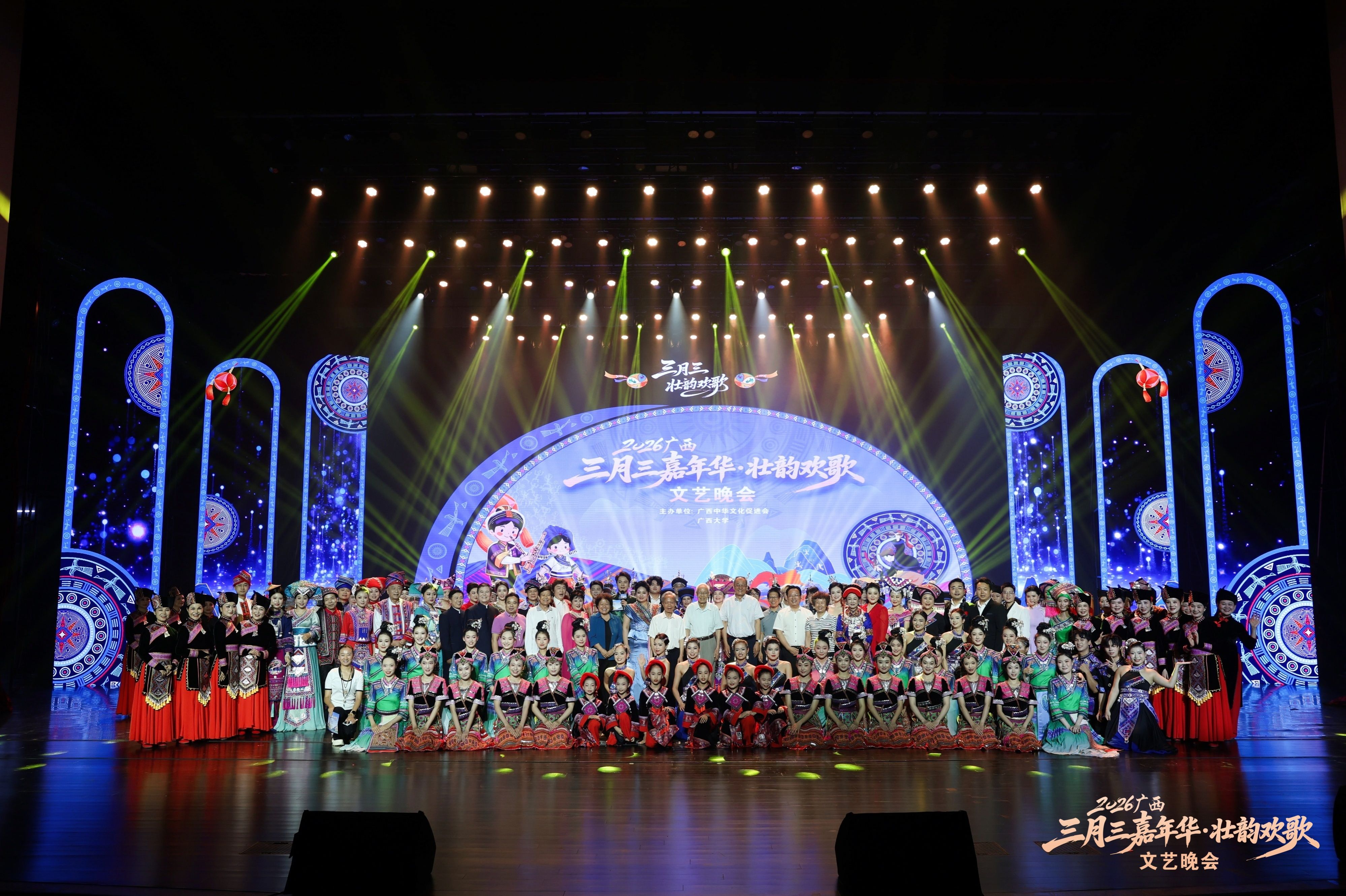 4月15日晚,由广西中华文化促进会和广西大学联合主办的“2026广西三月三嘉年华·壮韵欢歌”文艺晚会在我校汇学堂精彩上演。广西中华文化促进会创会主席李振潜、现任主席王跃飞、第三届主席文明,自治区政协原副主席李康,自治区高级人民法院原院长罗殿龙,广西中华文化促进会常务副主席兼秘书长唐宁,自治区党委社会工作部二级巡视员蒙昭平,广西大学党委副书记宁旭初,广西中华文化促进会常务副主席禤思、张耀民等领导嘉宾,与广西大学师生及各界代表1000余人欢聚一堂,共同观看演出。