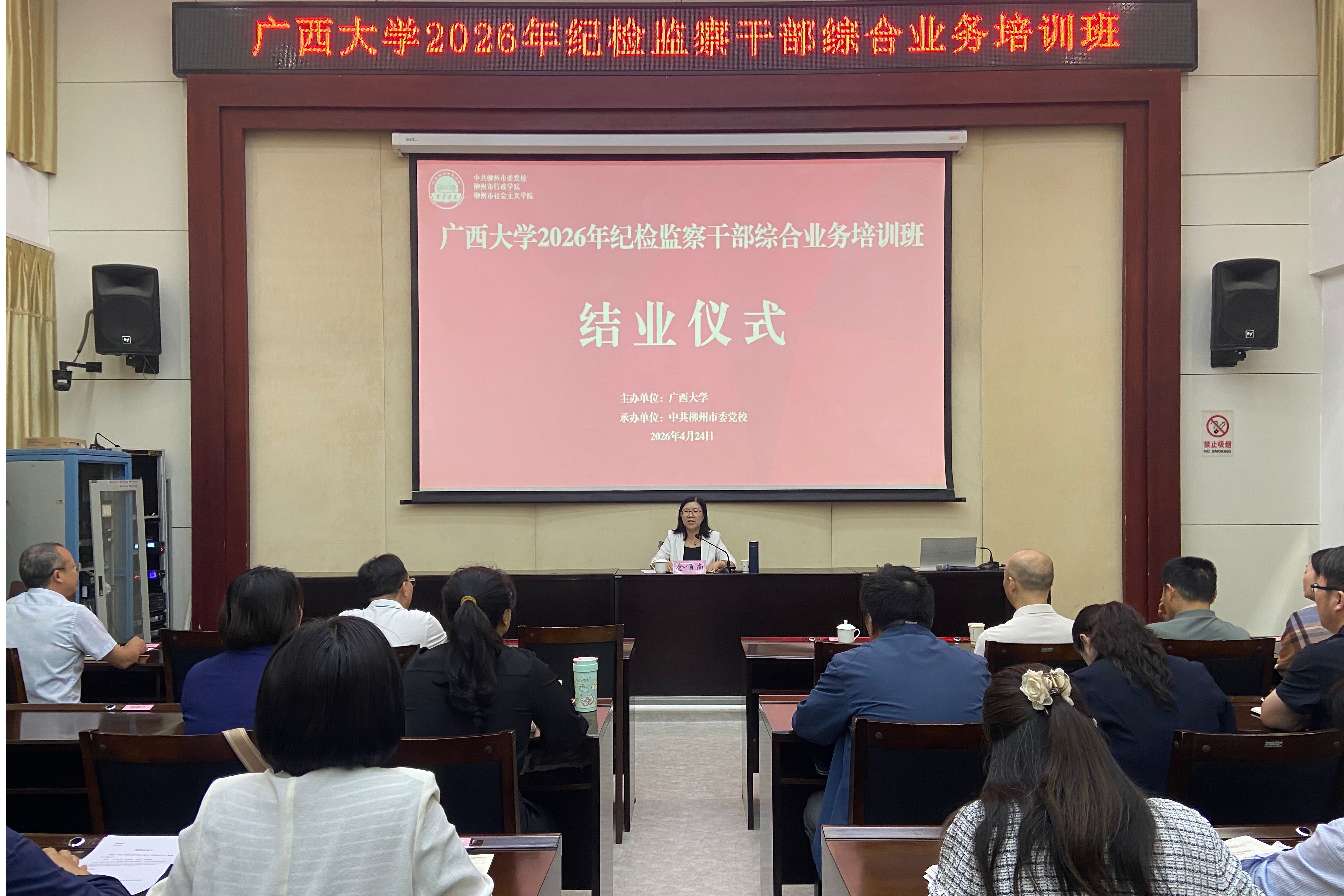 近日,我校2026年纪检监察干部综合业务培训班在柳州市委党校举办。校党委副书记、自治区纪委监委驻广西大学纪检监察组组长、校纪委书记金顺南出席结业仪式并讲话。